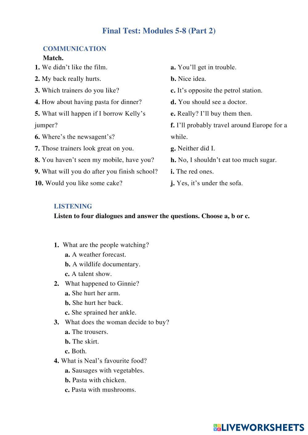 Created byMaryna Nezhyva English as a Second Language (ESL) Tests and exams Age 11-18 level: 2-3 English Author's Instructions Final Test: Modules 5-8 (Part 2) reading listening communication writing My Google Classroom Courses × 0 classes selected (0 students total) Quick Access Select all classes (0 classes) All Classes Loading courses... Cancel Share Share to selected Course __COURSE_NAME__ __STUDENT_NAME__ (__STUDENT_EMAIL__) Final Test Full Blast 6: Modules 5-8 (Part 2) Download Worksheet Validation Check my answers Emails my answers to my teacher Full name Group/level School subject Teacher's email or key code Close Submit Validating worksheet... (12) Your answers have been sent to your teacher. Good luck! OK We encountered an error submitting your answers. Please try again. OK Advertisement | Go Ad Free Created byMaryna Nezhyva English as a Second Language (ESL) Tests and exams Age 11-18 level: 2-3 English Author's Instructions Final Test: Modules 5-8 (Part 2) reading listening communication writing