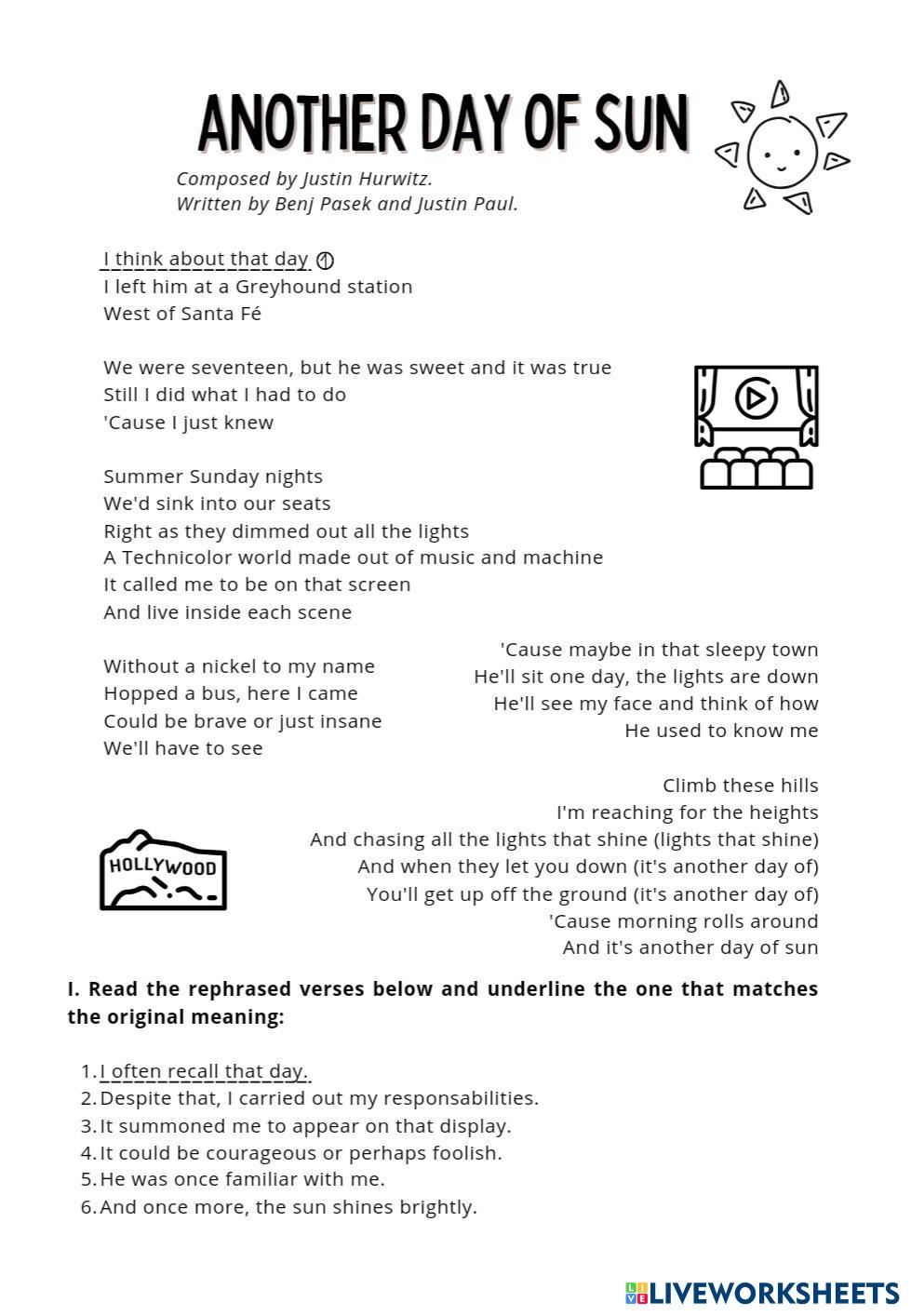 Created byValentina Fernandez English as a Second Language (ESL) Reading comprehension Age 18+ level: B2 English Author's Instructions My Google Classroom Courses × 0 classes selected (0 students total) Quick Access Select all classes (0 classes) All Classes Loading courses... Cancel Share Share to selected Course __COURSE_NAME__ __STUDENT_NAME__ (__STUDENT_EMAIL__) Another day of sun Download Worksheet Validation Check my answers Emails my answers to my teacher Full name Group/level School subject Teacher's email or key code Close Submit Validating worksheet... (12) Your answers have been sent to your teacher. Good luck! OK We encountered an error submitting your answers. Please try again. OK Advertisement | Go Ad Free Created byValentina Fernandez English as a Second Language (ESL) Reading comprehension Age 18+ level: B2 English Author's Instructions
