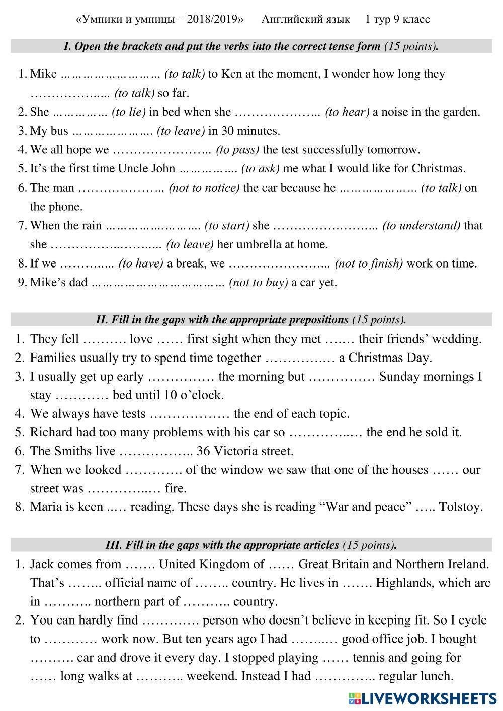 Created by Mika_tima English as a Second Language (ESL) Tests and exams Age 10+ level: 9 English Author's Instructions My Google Classroom Courses × 0 classes selected (0 students total) Quick Access Select all classes (0 classes) All Classes Loading courses... Cancel Share Share to selected Course __COURSE_NAME__ __STUDENT_NAME__ (__STUDENT_EMAIL__) УиУ 2018-2019 FORM 9 1 ТУР Download Worksheet Validation Check my answers Emails my answers to my teacher Full name Group/level School subject Teacher's email or key code Close Submit Validating worksheet... (12) Your answers have been sent to your teacher. Good luck! OK We encountered an error submitting your answers. Please try again. OK Advertisement | Go Ad Free Created by Mika_tima English as a Second Language (ESL) Tests and exams Age 10+ level: 9 English Author's Instructions