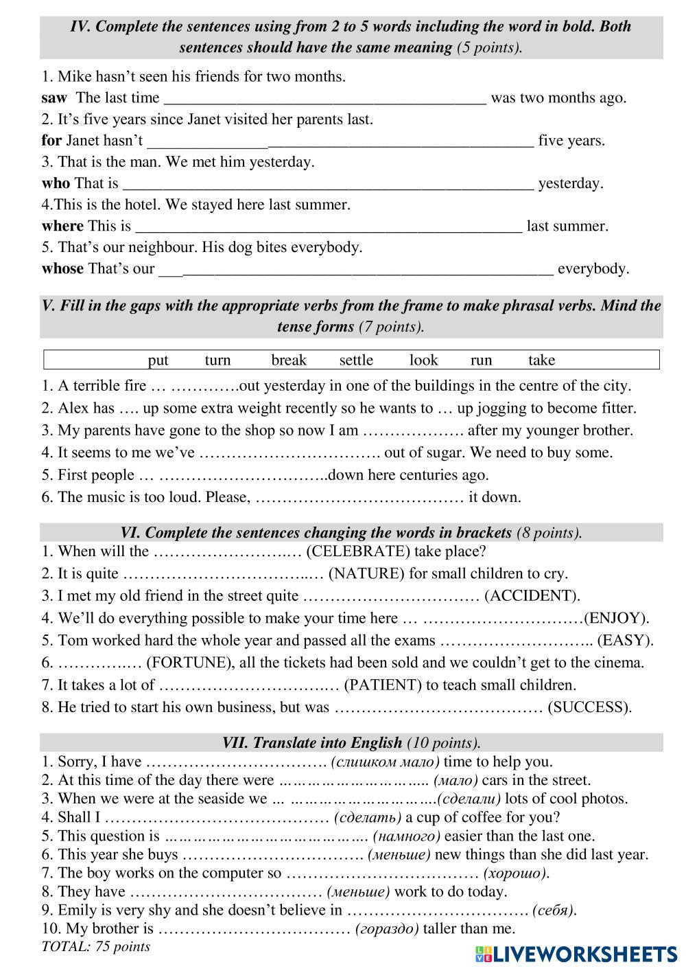Created by Mika_tima English as a Second Language (ESL) Tests and exams Age 10+ level: 9 English Author's Instructions My Google Classroom Courses × 0 classes selected (0 students total) Quick Access Select all classes (0 classes) All Classes Loading courses... Cancel Share Share to selected Course __COURSE_NAME__ __STUDENT_NAME__ (__STUDENT_EMAIL__) УиУ 2018-2019 FORM 9 2 ТУР Download Worksheet Validation Check my answers Emails my answers to my teacher Full name Group/level School subject Teacher's email or key code Close Submit Validating worksheet... (12) Your answers have been sent to your teacher. Good luck! OK We encountered an error submitting your answers. Please try again. OK Advertisement | Go Ad Free Created by Mika_tima English as a Second Language (ESL) Tests and exams Age 10+ level: 9 English Author's Instructions