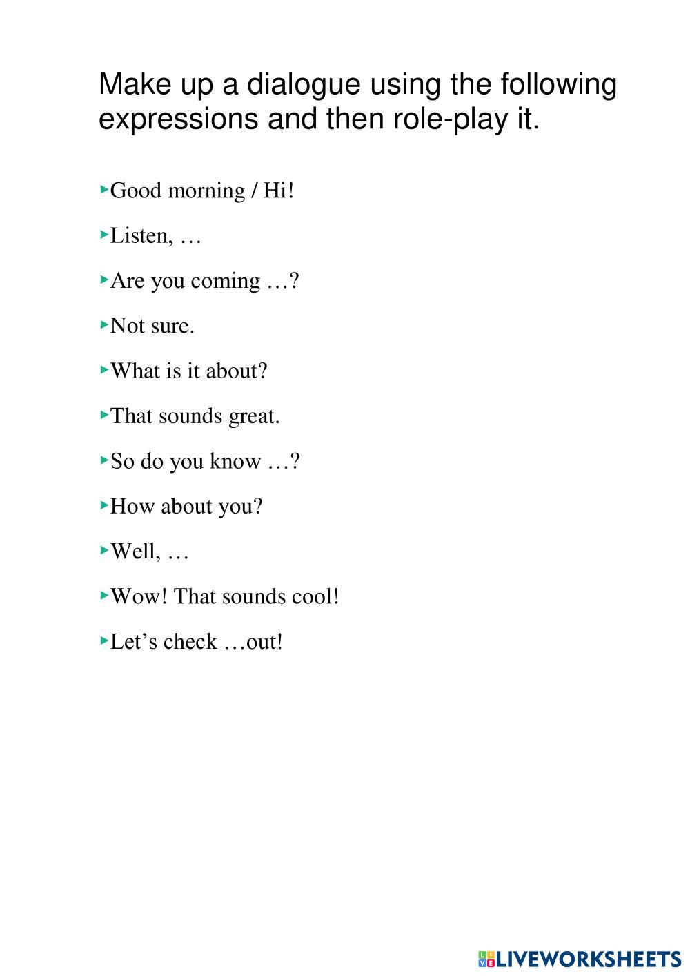 Created by botnaridoina English as a Second Language (ESL) Greetings Age 11+ level: A2 English Author's Instructions My Google Classroom Courses × 0 classes selected (0 students total) Quick Access Select all classes (0 classes) All Classes Loading courses... Cancel Share Share to selected Course __COURSE_NAME__ __STUDENT_NAME__ (__STUDENT_EMAIL__) Dialogue Download Worksheet Validation Check my answers Emails my answers to my teacher Full name Group/level School subject Teacher's email or key code Close Submit Validating worksheet... (12) Your answers have been sent to your teacher. Good luck! OK We encountered an error submitting your answers. Please try again. OK Advertisement | Go Ad Free Created by botnaridoina English as a Second Language (ESL) Greetings Age 11+ level: A2 English Author's Instructions
