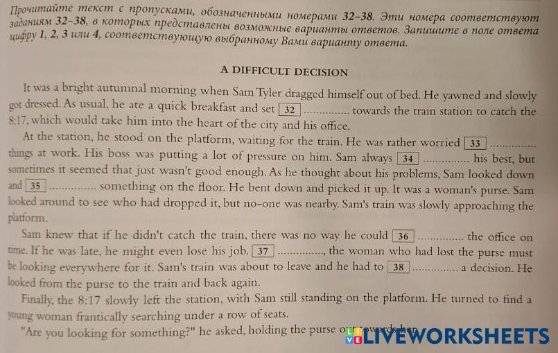 Created byЮлия Гулевич English as a Second Language (ESL) Exam practice Age 16+ level: 11 English Author's Instructions My Google Classroom Courses × 0 classes selected (0 students total) Quick Access Select all classes (0 classes) All Classes Loading courses... Cancel Share Share to selected Course __COURSE_NAME__ __STUDENT_NAME__ (__STUDENT_EMAIL__) EGE 30-36 Download Worksheet Validation Check my answers Emails my answers to my teacher Full name Group/level School subject Teacher's email or key code Close Submit Validating worksheet... (12) Your answers have been sent to your teacher. Good luck! OK We encountered an error submitting your answers. Please try again. OK Advertisement | Go Ad Free Created byЮлия Гулевич English as a Second Language (ESL) Exam practice Age 16+ level: 11 English Author's Instructions