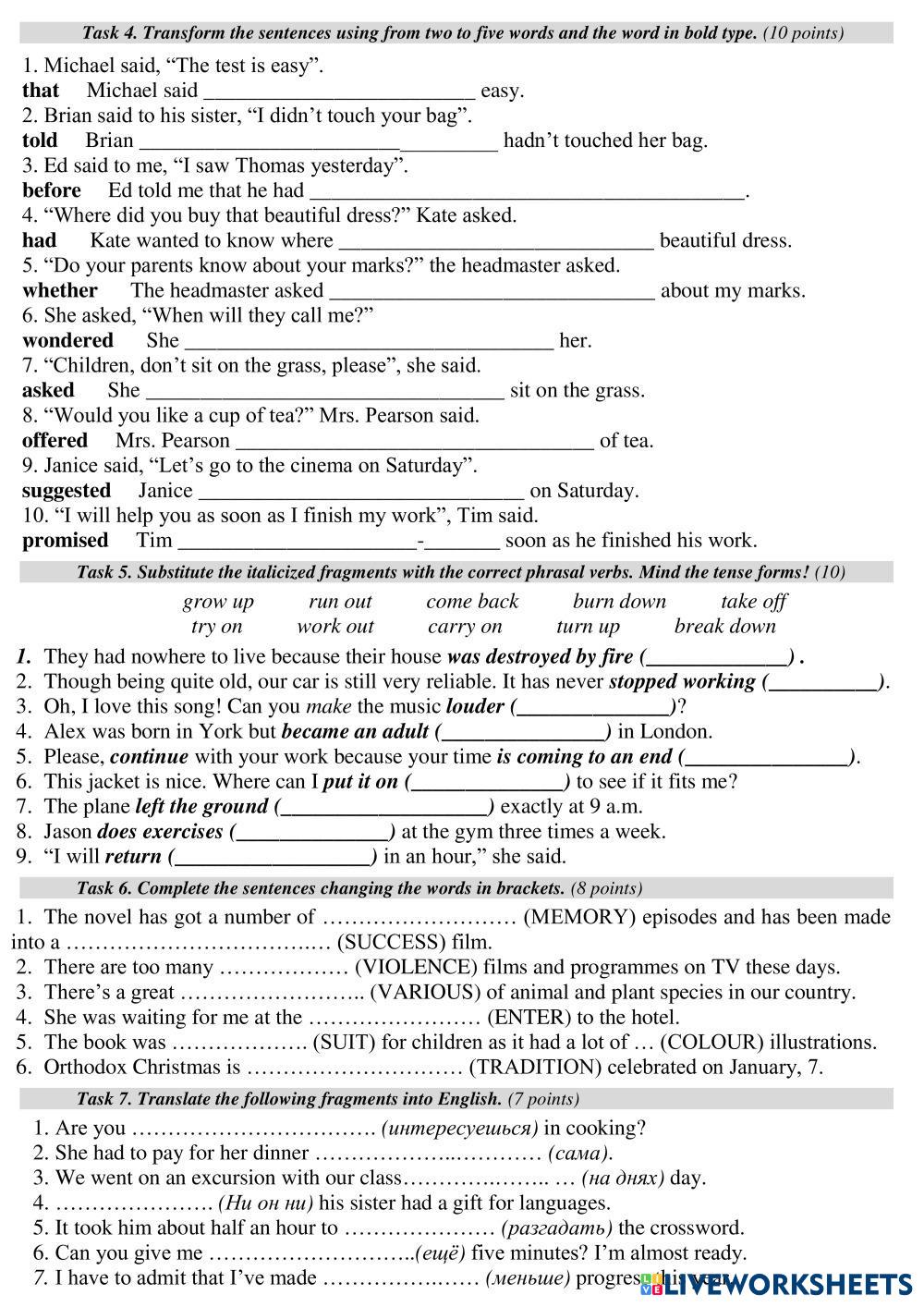 Created by Mika_tima English as a Second Language (ESL) Tests and exams Age 10+ level: 9 English Author's Instructions My Google Classroom Courses × 0 classes selected (0 students total) Quick Access Select all classes (0 classes) All Classes Loading courses... Cancel Share Share to selected Course __COURSE_NAME__ __STUDENT_NAME__ (__STUDENT_EMAIL__) УиУ 2019-2020 FORM 9 2 ТУР Download Worksheet Validation Check my answers Emails my answers to my teacher Full name Group/level School subject Teacher's email or key code Close Submit Validating worksheet... (12) Your answers have been sent to your teacher. Good luck! OK We encountered an error submitting your answers. Please try again. OK Advertisement | Go Ad Free Created by Mika_tima English as a Second Language (ESL) Tests and exams Age 10+ level: 9 English Author's Instructions