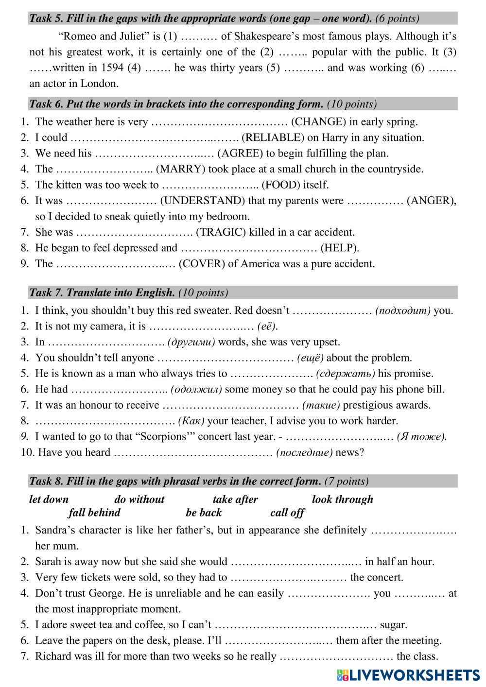 Created by Mika_tima English as a Second Language (ESL) Tests and exams Age 10+ level: 9 English Author's Instructions My Google Classroom Courses × 0 classes selected (0 students total) Quick Access Select all classes (0 classes) All Classes Loading courses... Cancel Share Share to selected Course __COURSE_NAME__ __STUDENT_NAME__ (__STUDENT_EMAIL__) УиУ 2019-2020 FORM 9 3 ТУР Download Worksheet Validation Check my answers Emails my answers to my teacher Full name Group/level School subject Teacher's email or key code Close Submit Validating worksheet... (12) Your answers have been sent to your teacher. Good luck! OK We encountered an error submitting your answers. Please try again. OK Advertisement | Go Ad Free Created by Mika_tima English as a Second Language (ESL) Tests and exams Age 10+ level: 9 English Author's Instructions