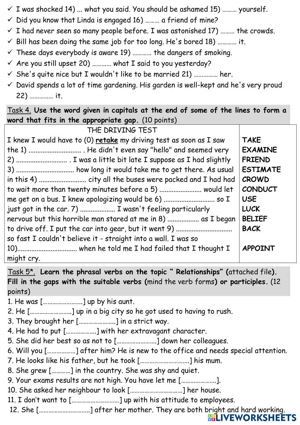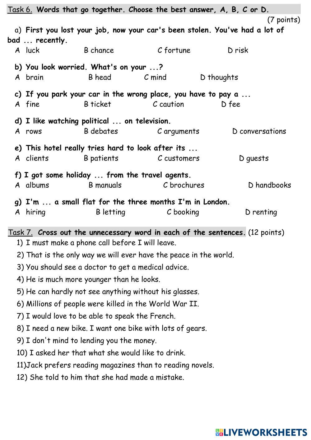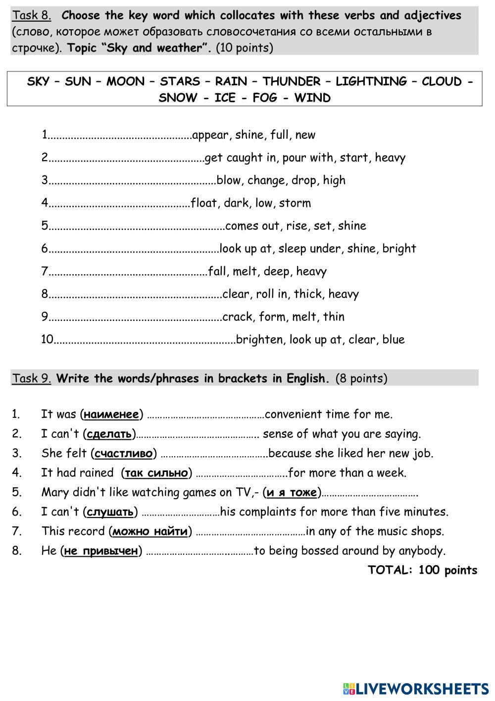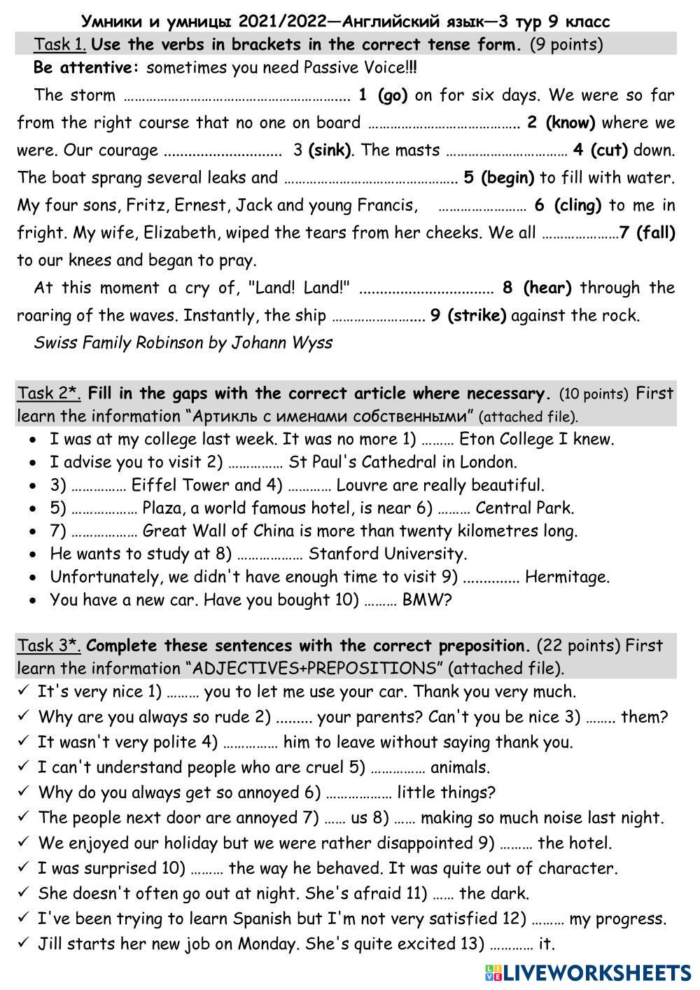 Created by Mika_tima English as a Second Language (ESL) Tests and exams Age 10+ level: 9 English Author's Instructions My Google Classroom Courses × 0 classes selected (0 students total) Quick Access Select all classes (0 classes) All Classes Loading courses... Cancel Share Share to selected Course __COURSE_NAME__ __STUDENT_NAME__ (__STUDENT_EMAIL__) УиУ 2021-2022 FORM 9 3 ТУР Download Worksheet Validation Check my answers Emails my answers to my teacher Full name Group/level School subject Teacher's email or key code Close Submit Validating worksheet... (12) Your answers have been sent to your teacher. Good luck! OK We encountered an error submitting your answers. Please try again. OK Advertisement | Go Ad Free Created by Mika_tima English as a Second Language (ESL) Tests and exams Age 10+ level: 9 English Author's Instructions