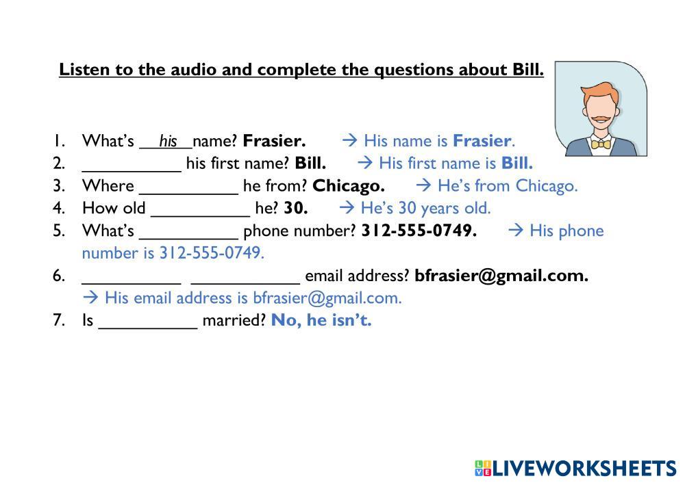 Created by consuelo5 English as a Second Language (ESL) Personal information questions Age 5+ level: BEGINNER English Author's Instructions My Google Classroom Courses × 0 classes selected (0 students total) Quick Access Select all classes (0 classes) All Classes Loading courses... Cancel Share Share to selected Course __COURSE_NAME__ __STUDENT_NAME__ (__STUDENT_EMAIL__) PERSONAL INFORMATION QUESTIONS Download Worksheet Validation Check my answers Emails my answers to my teacher Full name Group/level School subject Teacher's email or key code Close Submit Validating worksheet... (12) Your answers have been sent to your teacher. Good luck! OK We encountered an error submitting your answers. Please try again. OK Advertisement | Go Ad Free Created by consuelo5 English as a Second Language (ESL) Personal information questions Age 5+ level: BEGINNER English Author's Instructions