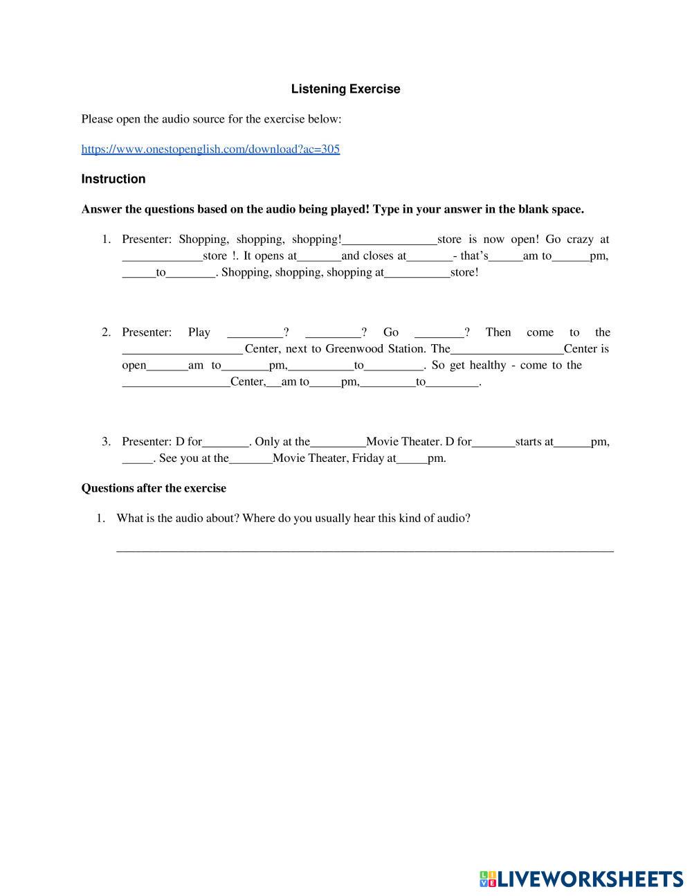 Created by IvanaJJJ English as a Second Language (ESL) Advertisements Age 12-17 level: Intermediate English Author's Instructions My Google Classroom Courses × 0 classes selected (0 students total) Quick Access Select all classes (0 classes) All Classes Loading courses... Cancel Share Share to selected Course __COURSE_NAME__ __STUDENT_NAME__ (__STUDENT_EMAIL__) Listening Exercise Download Worksheet Validation Check my answers Emails my answers to my teacher Full name Group/level School subject Teacher's email or key code Close Submit Validating worksheet... (12) Your answers have been sent to your teacher. Good luck! OK We encountered an error submitting your answers. Please try again. OK Advertisement | Go Ad Free Created by IvanaJJJ English as a Second Language (ESL) Advertisements Age 12-17 level: Intermediate English Author's Instructions