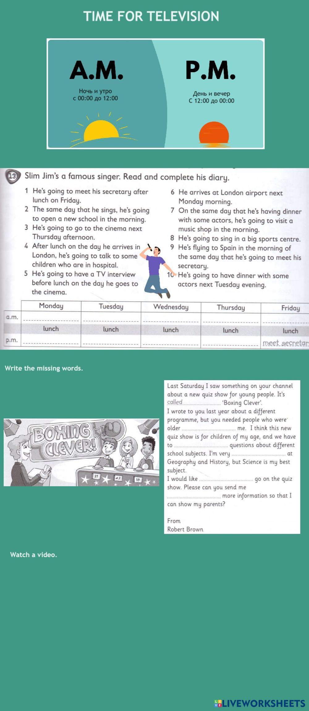 Created byRoyal English as a Second Language (ESL) Revision Age 5-16 level: elementary English Author's Instructions My Google Classroom Courses × 0 classes selected (0 students total) Quick Access Select all classes (0 classes) All Classes Loading courses... Cancel Share Share to selected Course __COURSE_NAME__ __STUDENT_NAME__ (__STUDENT_EMAIL__) Kid's box 5 Time for television Download Worksheet Validation Check my answers Emails my answers to my teacher Full name Group/level School subject Teacher's email or key code Close Submit Validating worksheet... (12) Your answers have been sent to your teacher. Good luck! OK We encountered an error submitting your answers. Please try again. OK Advertisement | Go Ad Free Created byRoyal English as a Second Language (ESL) Revision Age 5-16 level: elementary English Author's Instructions