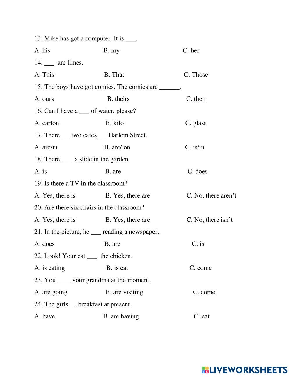 Created by keymeans English as a Second Language (ESL) Final Test Age 11-15 level: UP 2 English Author's Instructions My Google Classroom Courses × 0 classes selected (0 students total) Quick Access Select all classes (0 classes) All Classes Loading courses... Cancel Share Share to selected Course __COURSE_NAME__ __STUDENT_NAME__ (__STUDENT_EMAIL__) FINAL TEST Download Worksheet Validation Check my answers Emails my answers to my teacher Full name Group/level School subject Teacher's email or key code Close Submit Validating worksheet... (12) Your answers have been sent to your teacher. Good luck! OK We encountered an error submitting your answers. Please try again. OK Advertisement | Go Ad Free Created by keymeans English as a Second Language (ESL) Final Test Age 11-15 level: UP 2 English Author's Instructions