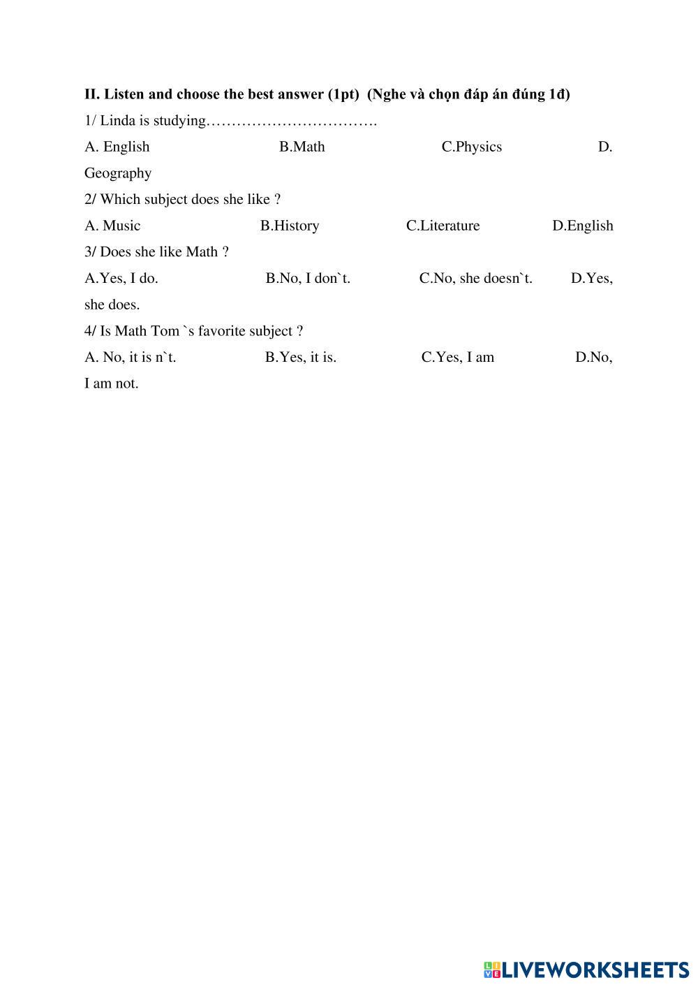 Created byNguyen nghia thu English as a Second Language (ESL) Test 1 Age 13-18 level: A 1 English Author's Instructions My Google Classroom Courses × 0 classes selected (0 students total) Quick Access Select all classes (0 classes) All Classes Loading courses... Cancel Share Share to selected Course __COURSE_NAME__ __STUDENT_NAME__ (__STUDENT_EMAIL__) Exercise Download Worksheet Validation Check my answers Emails my answers to my teacher Full name Group/level School subject Teacher's email or key code Close Submit Validating worksheet... (12) Your answers have been sent to your teacher. Good luck! OK We encountered an error submitting your answers. Please try again. OK Advertisement | Go Ad Free Created byNguyen nghia thu English as a Second Language (ESL) Test 1 Age 13-18 level: A 1 English Author's Instructions