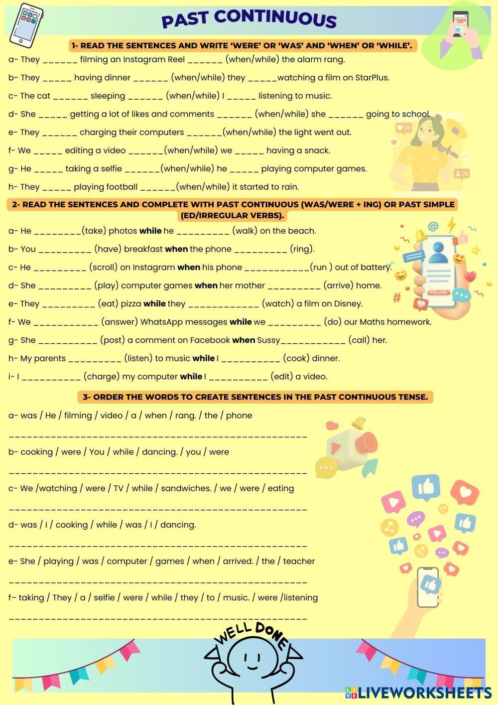 Practice the written form of the Past Continuous Tense and the use of 'when' and 'while'.