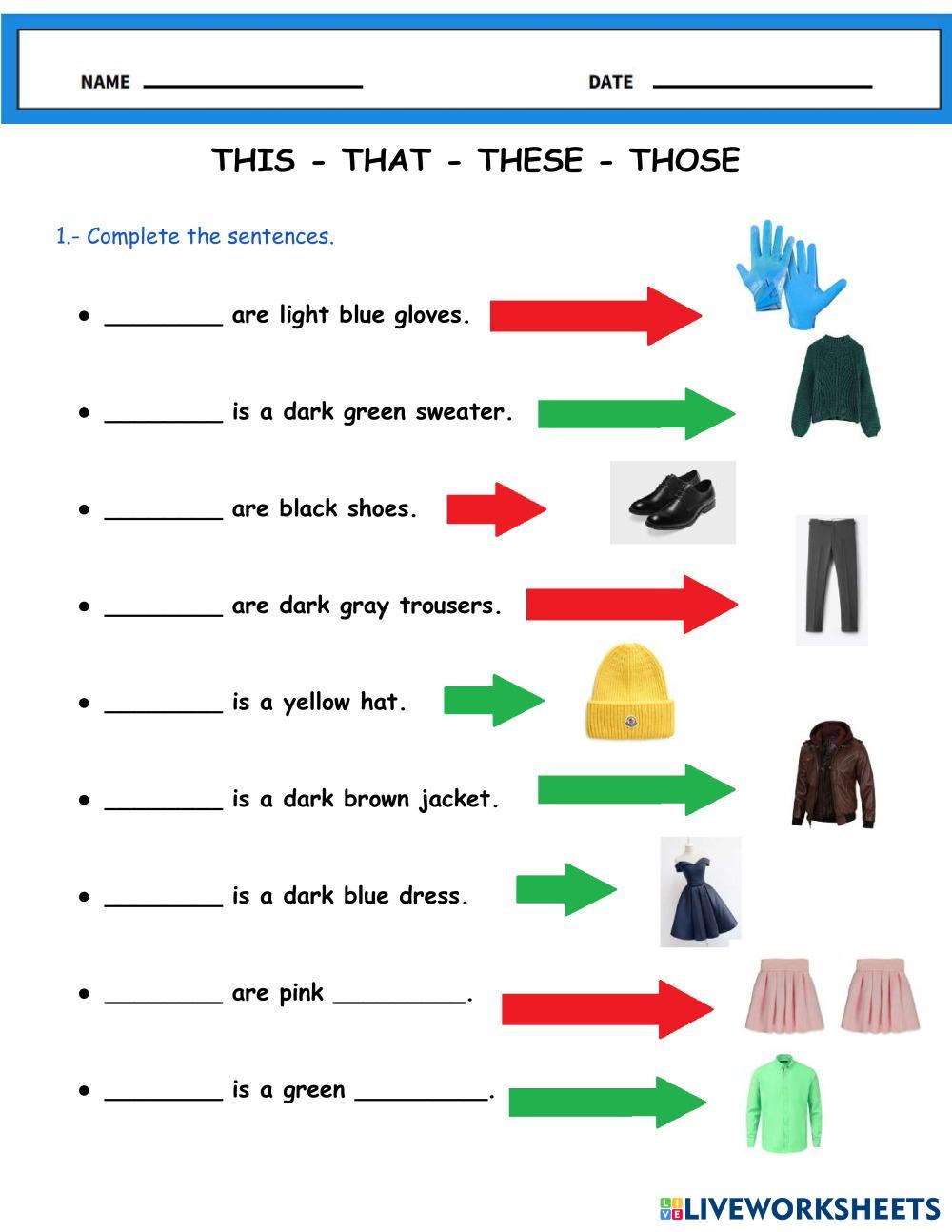 Created byRonny Glenn Chávez Fernández English as a Second Language (ESL) Determiners Age 10+ level: A1 English Author's Instructions My Google Classroom Courses × 0 classes selected (0 students total) Quick Access Select all classes (0 classes) All Classes Loading courses... Cancel Share Share to selected Course __COURSE_NAME__ __STUDENT_NAME__ (__STUDENT_EMAIL__) THIS - THAT - THESE - THOSE Download Worksheet Validation Check my answers Emails my answers to my teacher Full name Group/level School subject Teacher's email or key code Close Submit Validating worksheet... (12) Your answers have been sent to your teacher. Good luck! OK We encountered an error submitting your answers. Please try again. OK Advertisement | Go Ad Free Created byRonny Glenn Chávez Fernández English as a Second Language (ESL) Determiners Age 10+ level: A1 English Author's Instructions