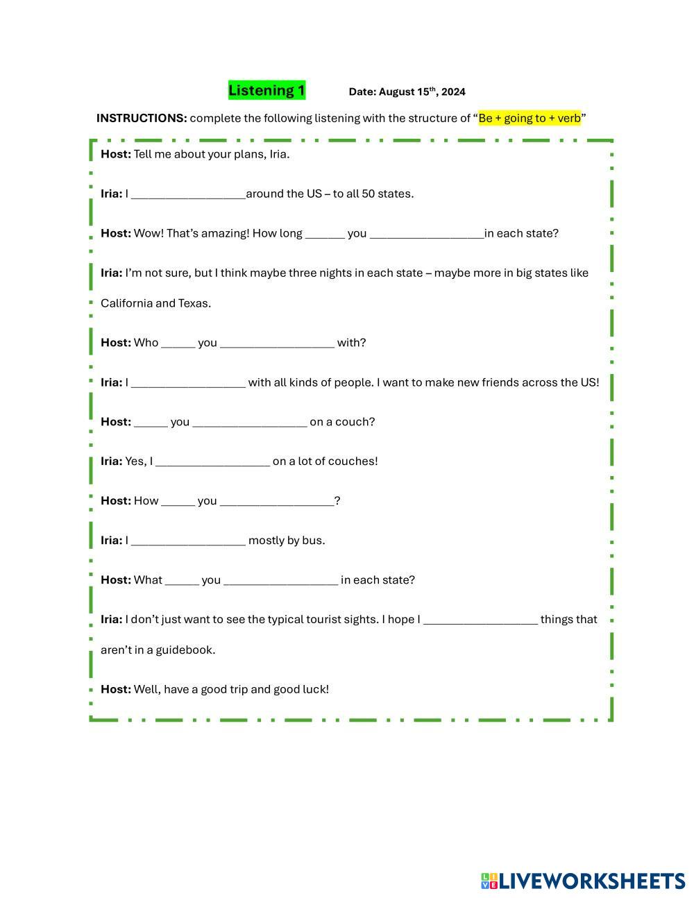Created by NATHALIEB English as a Second Language (ESL) Future be going to Age 12+ level: Beginners English Author's Instructions My Google Classroom Courses × 0 classes selected (0 students total) Quick Access Select all classes (0 classes) All Classes Loading courses... Cancel Share Share to selected Course __COURSE_NAME__ __STUDENT_NAME__ (__STUDENT_EMAIL__) Listening Activity_Be going to Download Worksheet Validation Check my answers Emails my answers to my teacher Full name Group/level School subject Teacher's email or key code Close Submit Validating worksheet... (12) Your answers have been sent to your teacher. Good luck! OK We encountered an error submitting your answers. Please try again. OK Advertisement | Go Ad Free Created by NATHALIEB English as a Second Language (ESL) Future be going to Age 12+ level: Beginners English Author's Instructions