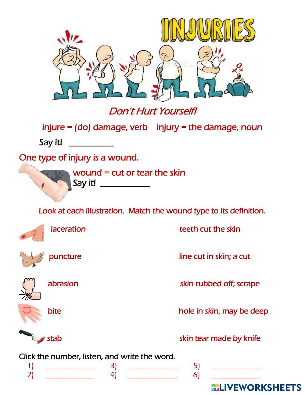 This worksheet introduces vocabulary for common wounds, e.g. punctures, abrasions. It provides practice in using reflexives with the verbs hurt (oneself), injure (oneself), cut (oneself.)