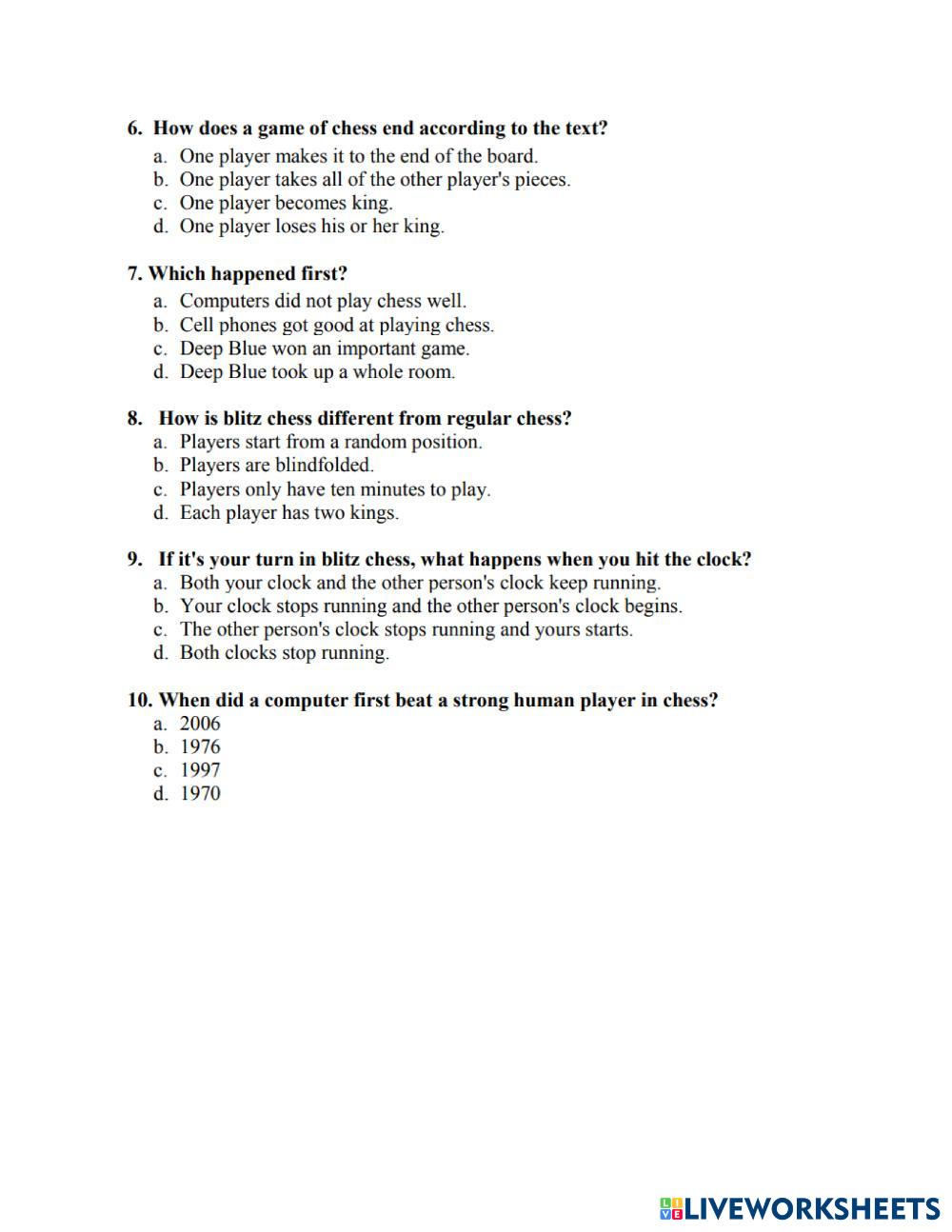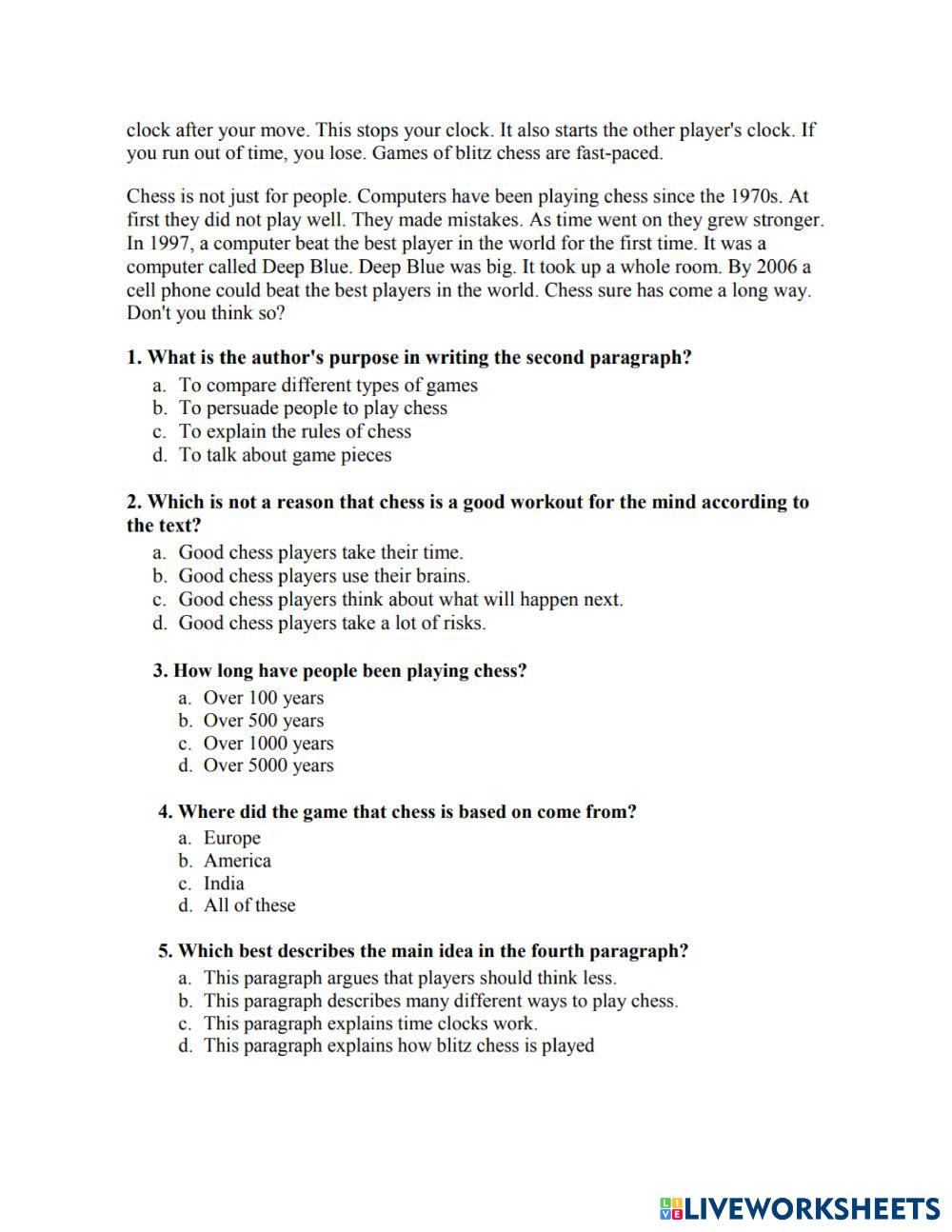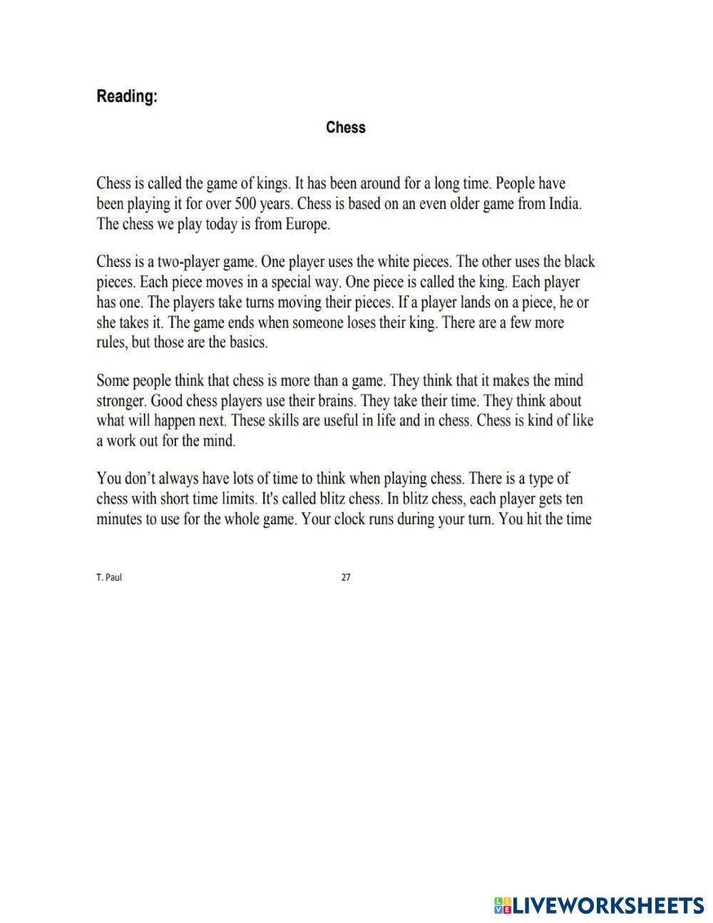 Created byMr. Christian Paul English as a Second Language (ESL) Chess Age 13-17 level: grade 8 English Author's Instructions My Google Classroom Courses × 0 classes selected (0 students total) Quick Access Select all classes (0 classes) All Classes Loading courses... Cancel Share Share to selected Course __COURSE_NAME__ __STUDENT_NAME__ (__STUDENT_EMAIL__) Reading Text Download Worksheet Validation Check my answers Emails my answers to my teacher Full name Group/level School subject Teacher's email or key code Close Submit Validating worksheet... (12) Your answers have been sent to your teacher. Good luck! OK We encountered an error submitting your answers. Please try again. OK Advertisement | Go Ad Free Created byMr. Christian Paul English as a Second Language (ESL) Chess Age 13-17 level: grade 8 English Author's Instructions