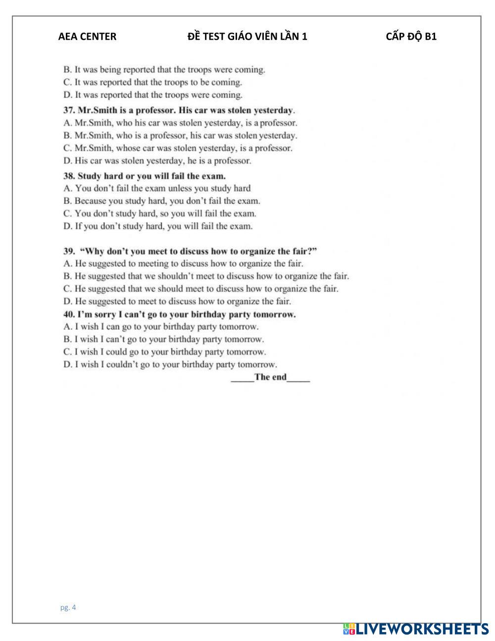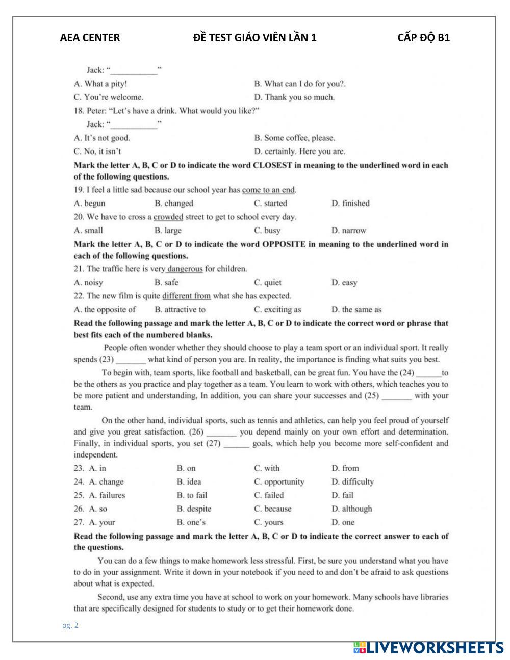 Created by maidang02 English as a Second Language (ESL) B1 Age 18+ level: B1 English Author's Instructions My Google Classroom Courses × 0 classes selected (0 students total) Quick Access Select all classes (0 classes) All Classes Loading courses... Cancel Share Share to selected Course __COURSE_NAME__ __STUDENT_NAME__ (__STUDENT_EMAIL__) ĐỀ TEST GIÁO VIÊN AEA LẦN 1 Download Worksheet Validation Check my answers Emails my answers to my teacher Full name Group/level School subject Teacher's email or key code Close Submit Validating worksheet... (12) Your answers have been sent to your teacher. Good luck! OK We encountered an error submitting your answers. Please try again. OK Advertisement | Go Ad Free Created by maidang02 English as a Second Language (ESL) B1 Age 18+ level: B1 English Author's Instructions