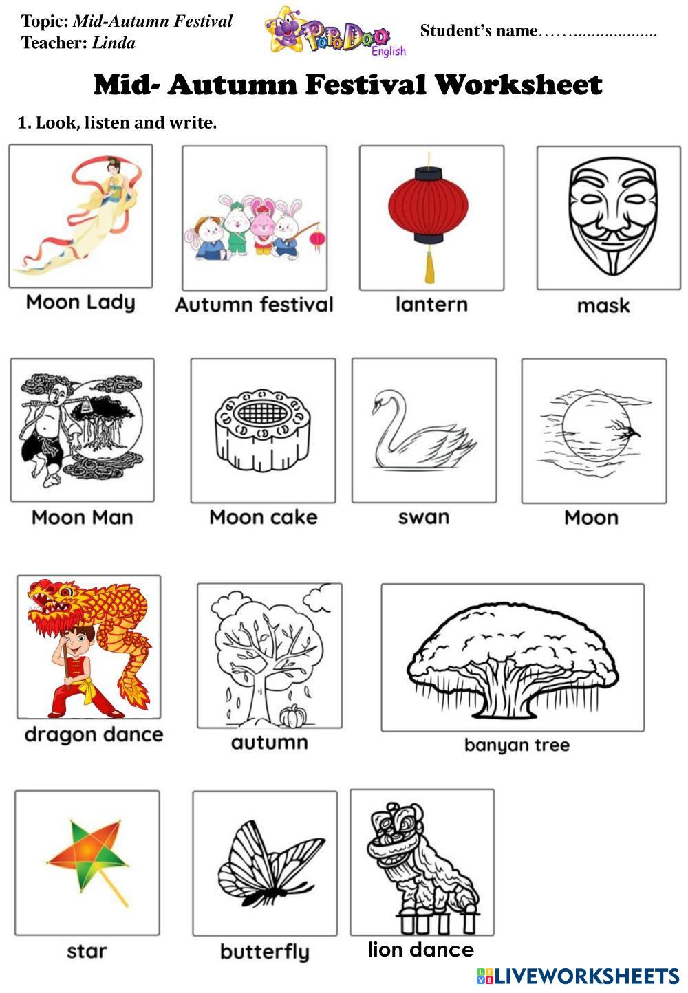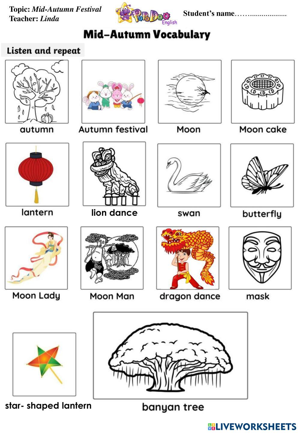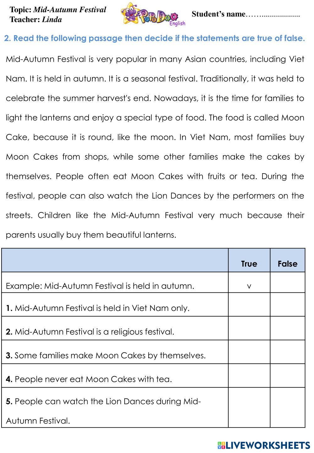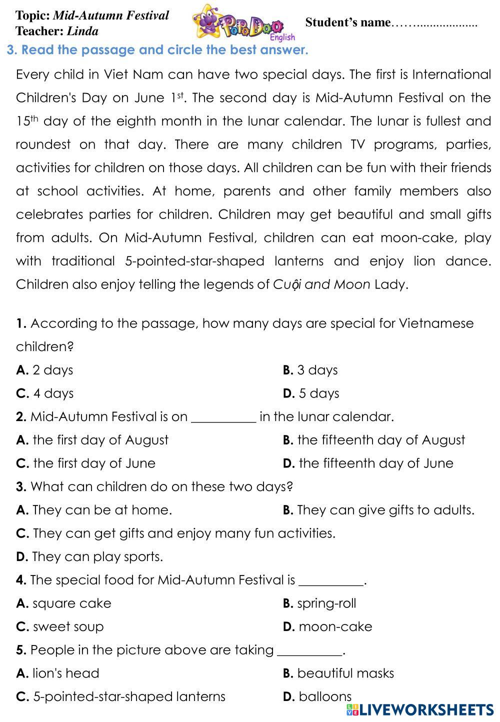 Created byVũ Thị Lan Anh English as a Second Language (ESL) Mid autumn festival Age 8-16 level: 4 English Author's Instructions My Google Classroom Courses × 0 classes selected (0 students total) Quick Access Select all classes (0 classes) All Classes Loading courses... Cancel Share Share to selected Course __COURSE_NAME__ __STUDENT_NAME__ (__STUDENT_EMAIL__) MID-AUTUMN FESTIVAL Download Worksheet Validation Check my answers Emails my answers to my teacher Full name Group/level School subject Teacher's email or key code Close Submit Validating worksheet... (12) Your answers have been sent to your teacher. Good luck! OK We encountered an error submitting your answers. Please try again. OK Advertisement | Go Ad Free Created byVũ Thị Lan Anh English as a Second Language (ESL) Mid autumn festival Age 8-16 level: 4 English Author's Instructions