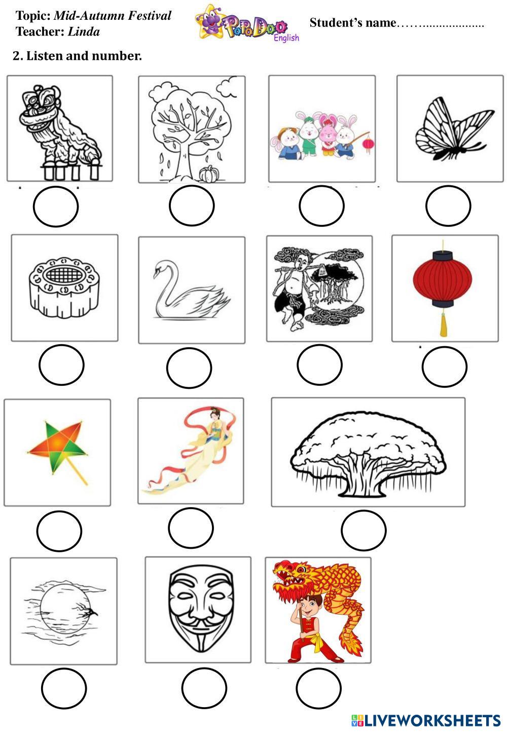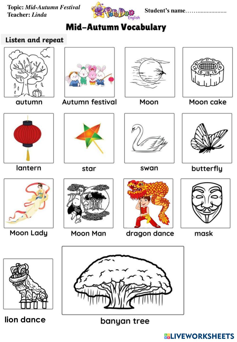 Created byVũ Thị Lan Anh English as a Second Language (ESL) Mid autumn festival Age 4-10 level: 1 English Author's Instructions My Google Classroom Courses × 0 classes selected (0 students total) Quick Access Select all classes (0 classes) All Classes Loading courses... Cancel Share Share to selected Course __COURSE_NAME__ __STUDENT_NAME__ (__STUDENT_EMAIL__) MID-AUTUMN FESTIVAL Download Worksheet Validation Check my answers Emails my answers to my teacher Full name Group/level School subject Teacher's email or key code Close Submit Validating worksheet... (12) Your answers have been sent to your teacher. Good luck! OK We encountered an error submitting your answers. Please try again. OK Advertisement | Go Ad Free Created byVũ Thị Lan Anh English as a Second Language (ESL) Mid autumn festival Age 4-10 level: 1 English Author's Instructions