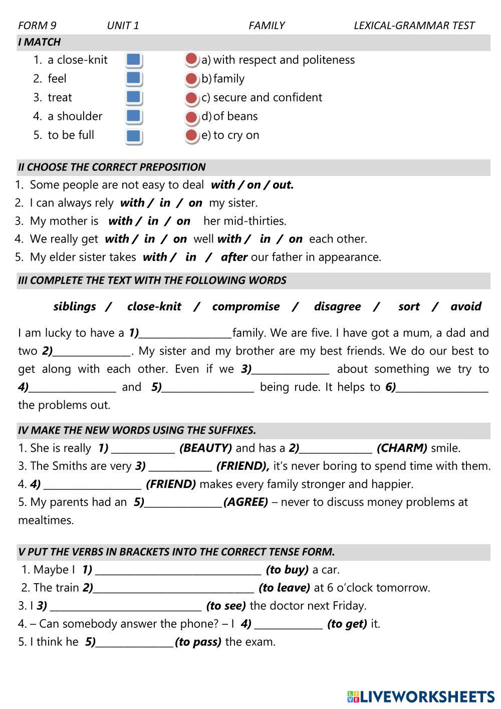 Created by Mika_tima English as a Second Language (ESL) Tests and exams Age 11+ level: 9 English Author's Instructions My Google Classroom Courses × 0 classes selected (0 students total) Quick Access Select all classes (0 classes) All Classes Loading courses... Cancel Share Share to selected Course __COURSE_NAME__ __STUDENT_NAME__ (__STUDENT_EMAIL__) Family relationships Test Form 9 Unit 1 Download Worksheet Validation Check my answers Emails my answers to my teacher Full name Group/level School subject Teacher's email or key code Close Submit Validating worksheet... (12) Your answers have been sent to your teacher. Good luck! OK We encountered an error submitting your answers. Please try again. OK Advertisement | Go Ad Free Created by Mika_tima English as a Second Language (ESL) Tests and exams Age 11+ level: 9 English Author's Instructions