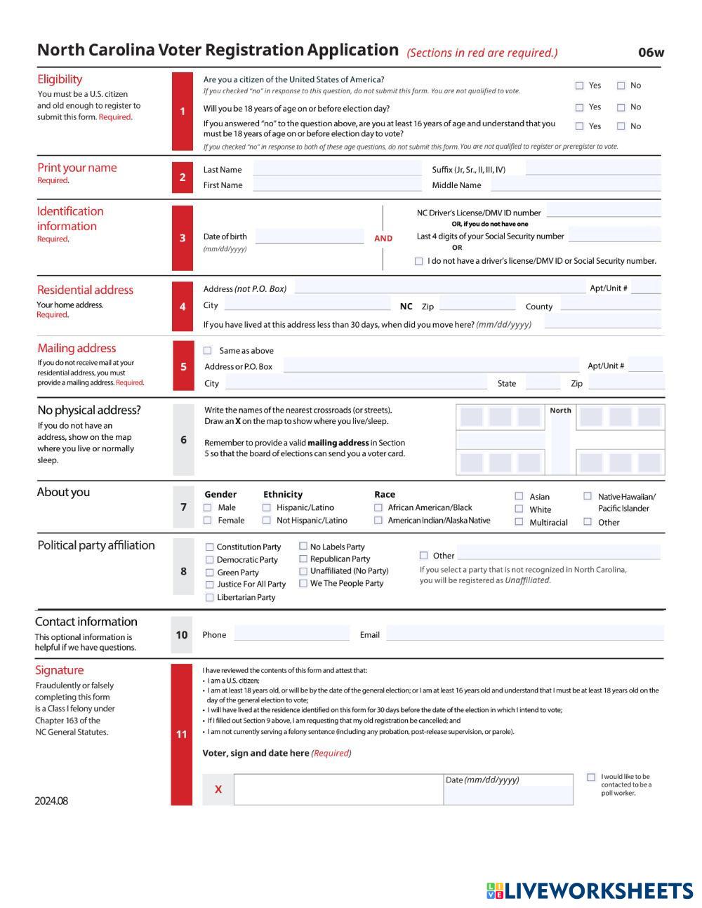 Students use government web resources to find information about registering to vote. Students practice filling out a voter registration form.