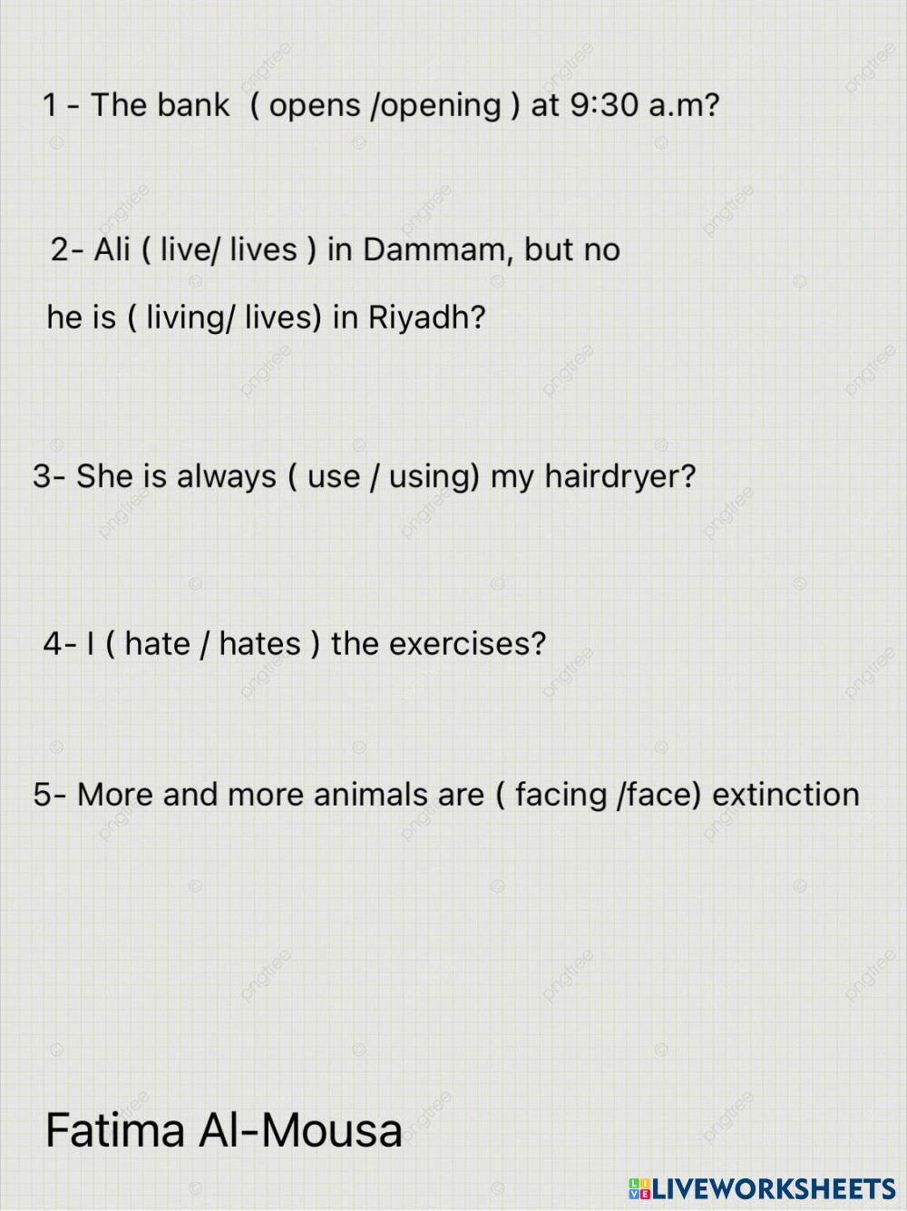 Created bysarasan English as a Second Language (ESL) English Age 12+ level: ... English Author's Instructions My Google Classroom Courses × 0 classes selected (0 students total) Quick Access Select all classes (0 classes) All Classes Loading courses... Cancel Share Share to selected Course __COURSE_NAME__ __STUDENT_NAME__ (__STUDENT_EMAIL__) fatima al mousa Download Worksheet Validation Check my answers Emails my answers to my teacher Full name Group/level School subject Teacher's email or key code Close Submit Validating worksheet... (12) Your answers have been sent to your teacher. Good luck! OK We encountered an error submitting your answers. Please try again. OK Advertisement | Go Ad Free Created bysarasan English as a Second Language (ESL) English Age 12+ level: ... English Author's Instructions