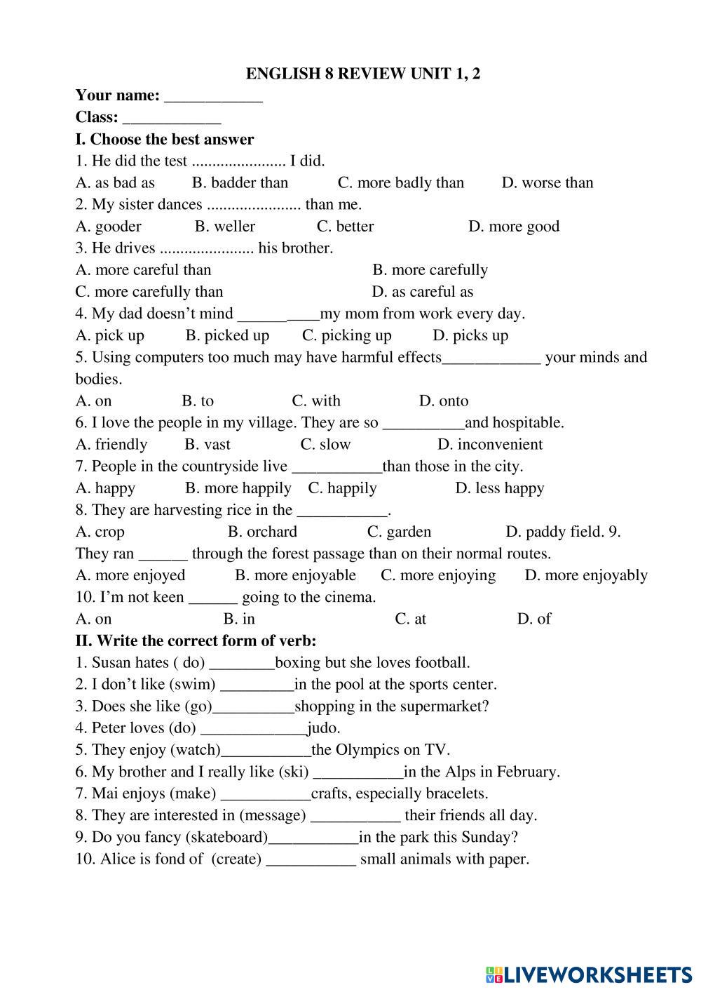 Created byNguyen Thi Thu Ha English as a Second Language (ESL) Multiple choices Age 12-18 level: GRADE 8 English Author's Instructions My Google Classroom Courses × 0 classes selected (0 students total) Quick Access Select all classes (0 classes) All Classes Loading courses... Cancel Share Share to selected Course __COURSE_NAME__ __STUDENT_NAME__ (__STUDENT_EMAIL__) MINI TEST FOR UNIT 1, 2 Download Worksheet Validation Check my answers Emails my answers to my teacher Full name Group/level School subject Teacher's email or key code Close Submit Validating worksheet... (12) Your answers have been sent to your teacher. Good luck! OK We encountered an error submitting your answers. Please try again. OK Advertisement | Go Ad Free Created byNguyen Thi Thu Ha English as a Second Language (ESL) Multiple choices Age 12-18 level: GRADE 8 English Author's Instructions