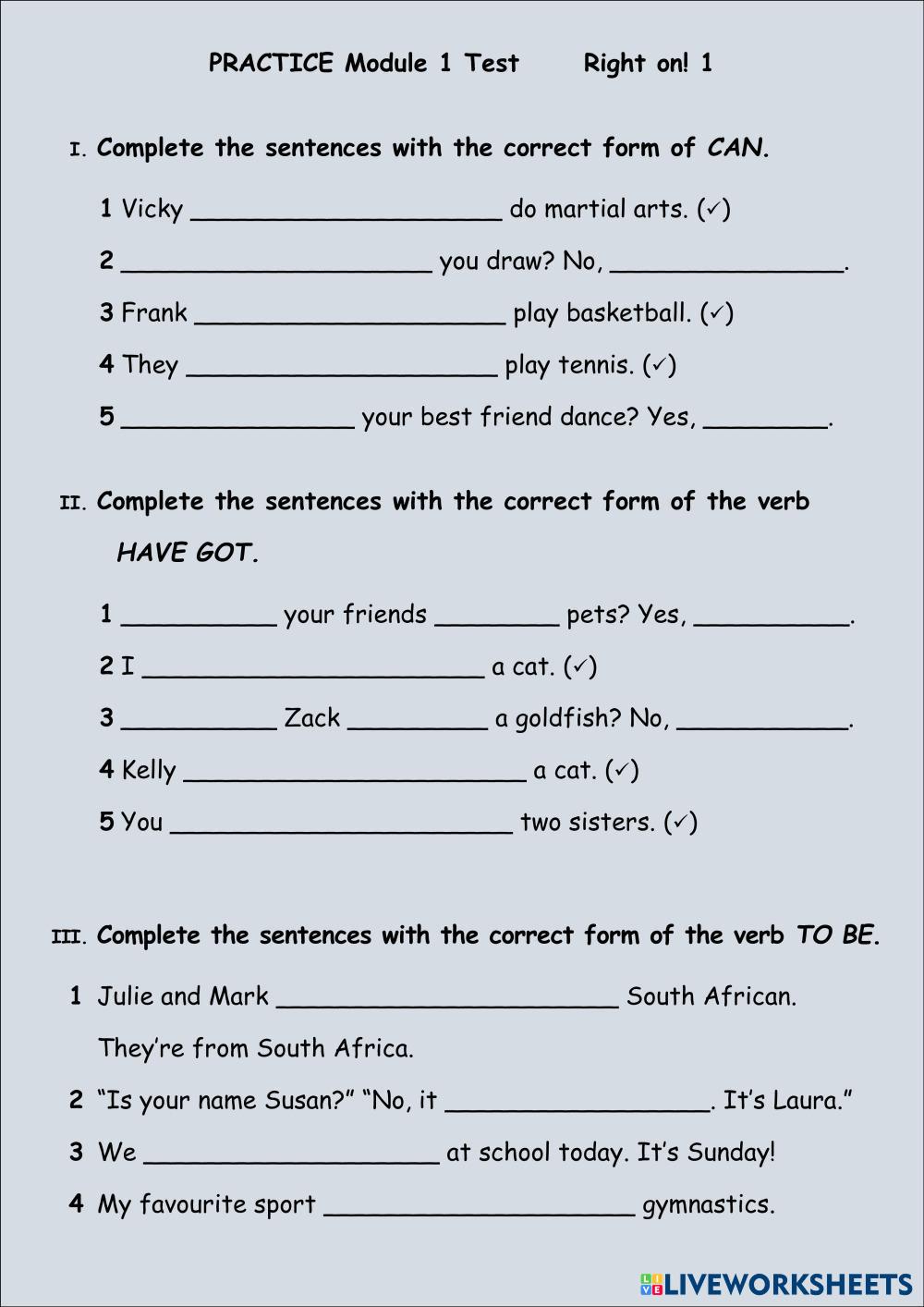 Created by funfamily English as a Second Language (ESL) Grammar Age 10-18 level: A1 English Author's Instructions My Google Classroom Courses × 0 classes selected (0 students total) Quick Access Select all classes (0 classes) All Classes Loading courses... Cancel Share Share to selected Course __COURSE_NAME__ __STUDENT_NAME__ (__STUDENT_EMAIL__) RO1 Module 1 Test practice Download Worksheet Validation Check my answers Emails my answers to my teacher Full name Group/level School subject Teacher's email or key code Close Submit Validating worksheet... (12) Your answers have been sent to your teacher. Good luck! OK We encountered an error submitting your answers. Please try again. OK Advertisement | Go Ad Free Created by funfamily English as a Second Language (ESL) Grammar Age 10-18 level: A1 English Author's Instructions