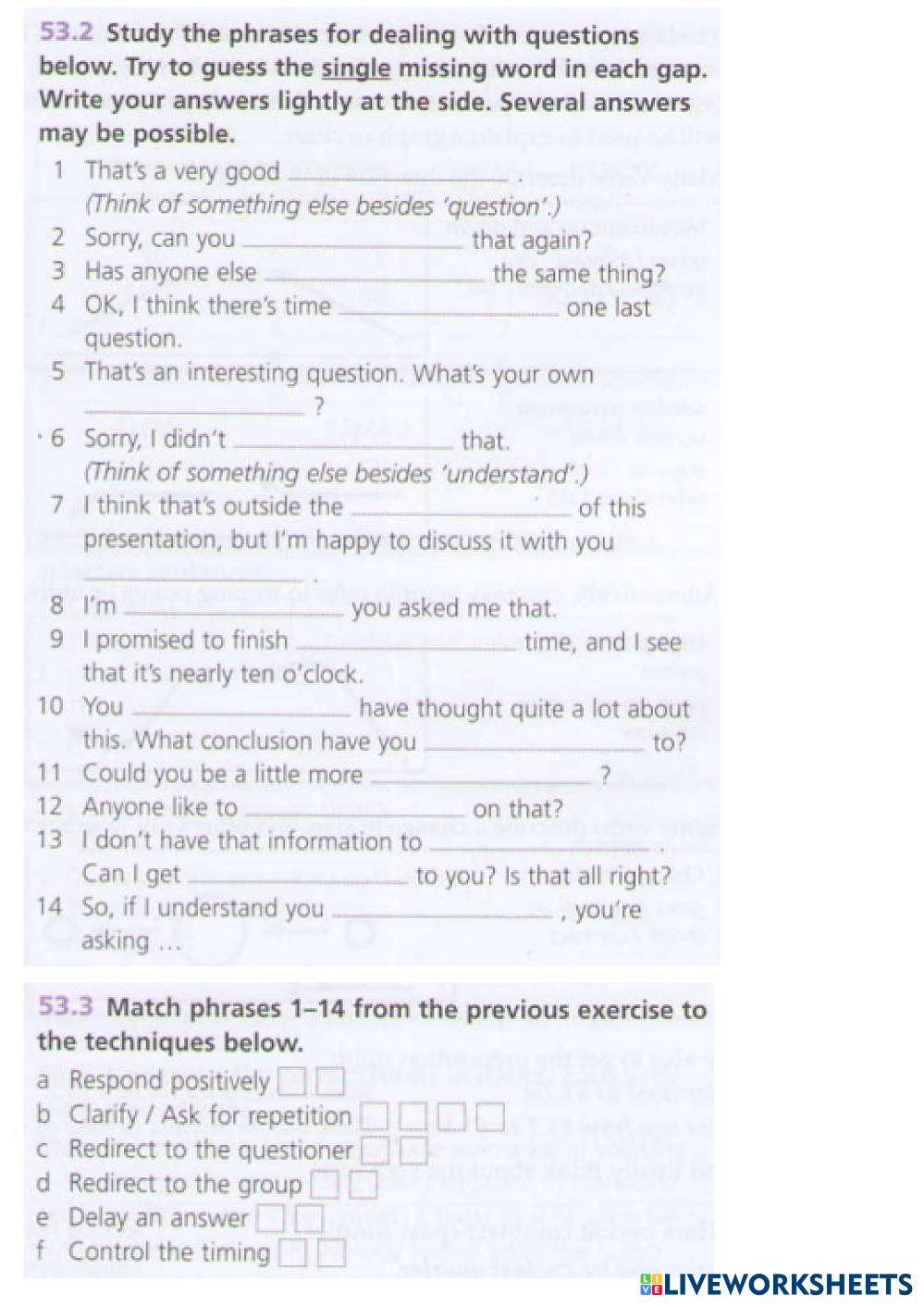 Created by annetavalinova English as a Second Language (ESL) Managing questions Age 18+ level: a2+ English Author's Instructions My Google Classroom Courses × 0 classes selected (0 students total) Quick Access Select all classes (0 classes) All Classes Loading courses... Cancel Share Share to selected Course __COURSE_NAME__ __STUDENT_NAME__ (__STUDENT_EMAIL__) Managing questions Download Worksheet Validation Check my answers Emails my answers to my teacher Full name Group/level School subject Teacher's email or key code Close Submit Validating worksheet... (12) Your answers have been sent to your teacher. Good luck! OK We encountered an error submitting your answers. Please try again. OK Advertisement | Go Ad Free Created by annetavalinova English as a Second Language (ESL) Managing questions Age 18+ level: a2+ English Author's Instructions