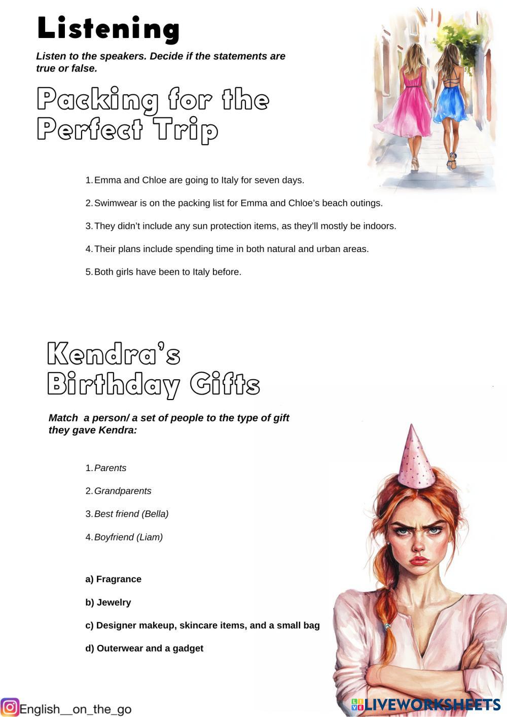 Created by life_line English as a Second Language (ESL) Listening comprehension Age 14+ level: intermediate English Author's Instructions My Google Classroom Courses × 0 classes selected (0 students total) Quick Access Select all classes (0 classes) All Classes Loading courses... Cancel Share Share to selected Course __COURSE_NAME__ __STUDENT_NAME__ (__STUDENT_EMAIL__) Packing for the Perfect Trip Download Worksheet Validation Check my answers Emails my answers to my teacher Full name Group/level School subject Teacher's email or key code Close Submit Validating worksheet... (12) Your answers have been sent to your teacher. Good luck! OK We encountered an error submitting your answers. Please try again. OK Advertisement | Go Ad Free Created by life_line English as a Second Language (ESL) Listening comprehension Age 14+ level: intermediate English Author's Instructions