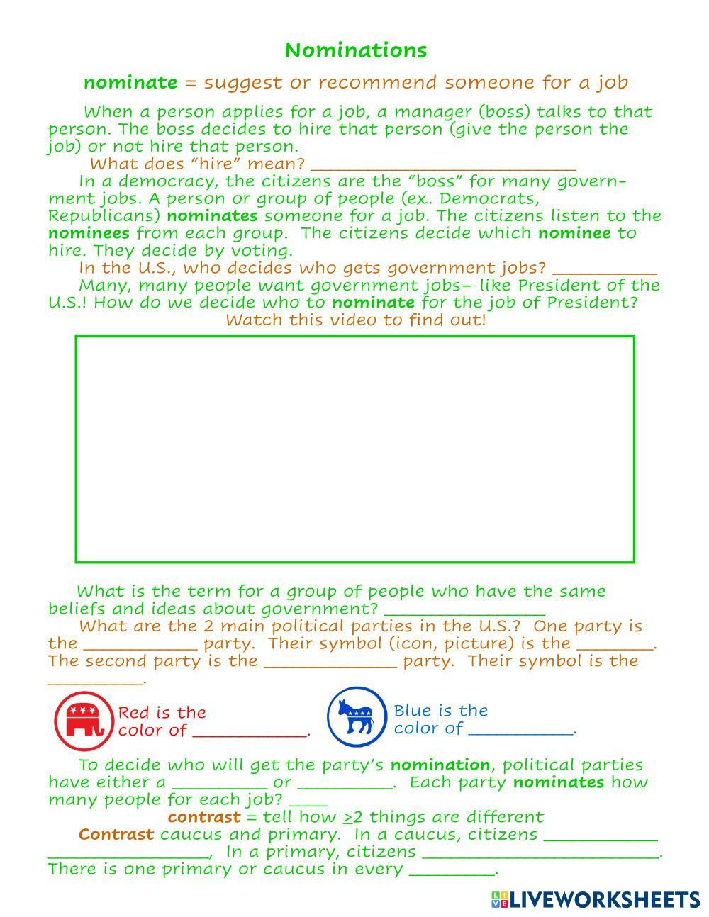 Students listen to videos about the nomination process for President of the U.S. They demonstrate comprehension by completing cloze activities.
