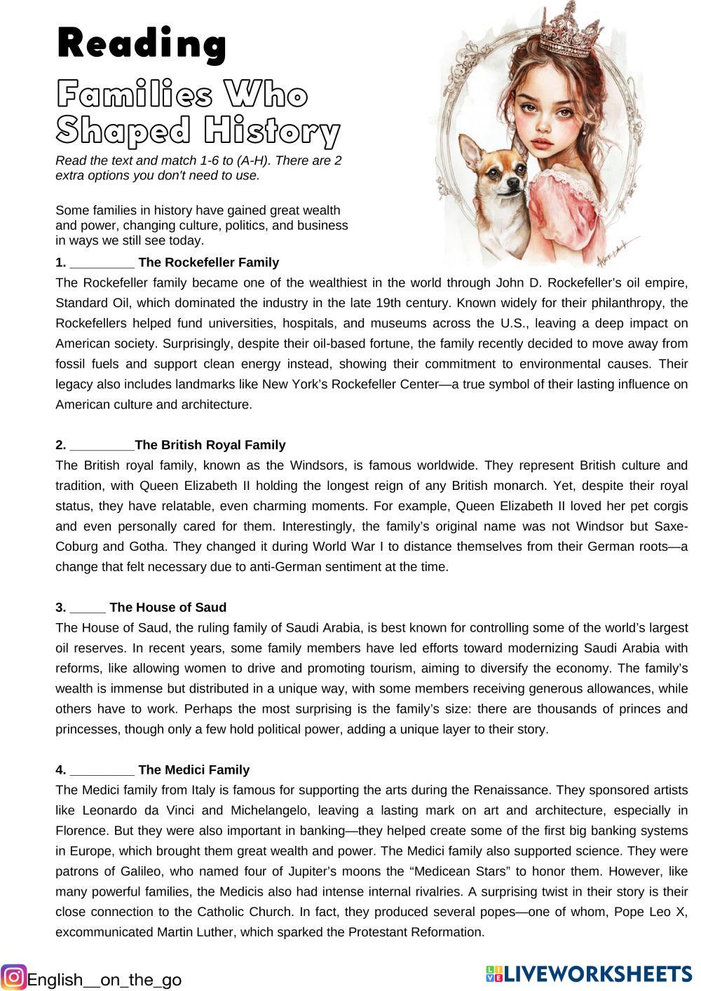 Created by life_line English as a Second Language (ESL) Reading comprehension Age 17+ level: intermediate English Author's Instructions My Google Classroom Courses × 0 classes selected (0 students total) Quick Access Select all classes (0 classes) All Classes Loading courses... Cancel Share Share to selected Course __COURSE_NAME__ __STUDENT_NAME__ (__STUDENT_EMAIL__) Families Who Shaped History Download Worksheet Validation Check my answers Emails my answers to my teacher Full name Group/level School subject Teacher's email or key code Close Submit Validating worksheet... (12) Your answers have been sent to your teacher. Good luck! OK We encountered an error submitting your answers. Please try again. OK Advertisement | Go Ad Free Created by life_line English as a Second Language (ESL) Reading comprehension Age 17+ level: intermediate English Author's Instructions