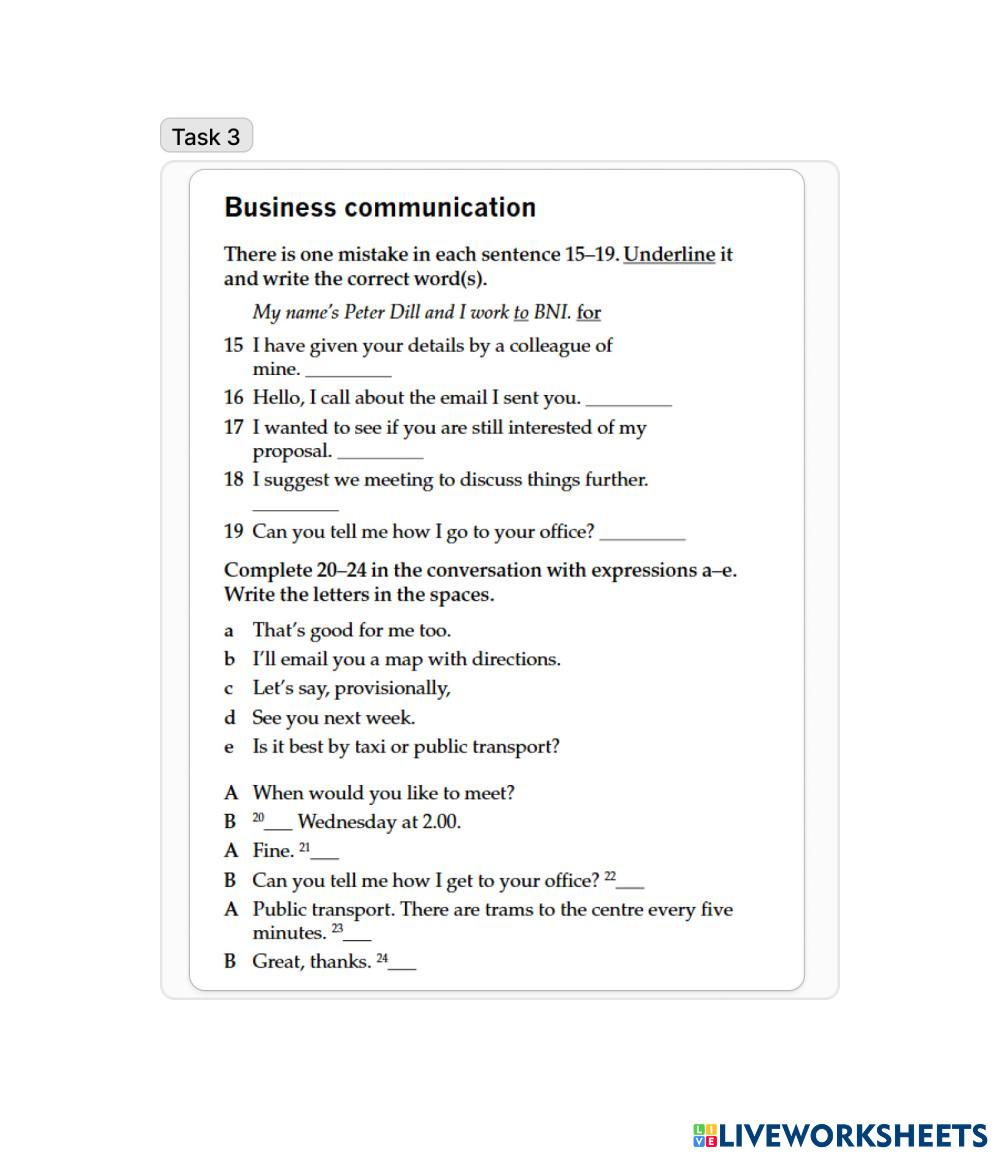Created byMango Cutie English as a Second Language (ESL) Business English Age 18+ level: Upper Intermediate English Author's Instructions My Google Classroom Courses × 0 classes selected (0 students total) Quick Access Select all classes (0 classes) All Classes Loading courses... Cancel Share Share to selected Course __COURSE_NAME__ __STUDENT_NAME__ (__STUDENT_EMAIL__) Business Result B2 U1 Review Download Worksheet Validation Check my answers Emails my answers to my teacher Full name Group/level School subject Teacher's email or key code Close Submit Validating worksheet... (12) Your answers have been sent to your teacher. Good luck! OK We encountered an error submitting your answers. Please try again. OK Advertisement | Go Ad Free Created byMango Cutie English as a Second Language (ESL) Business English Age 18+ level: Upper Intermediate English Author's Instructions