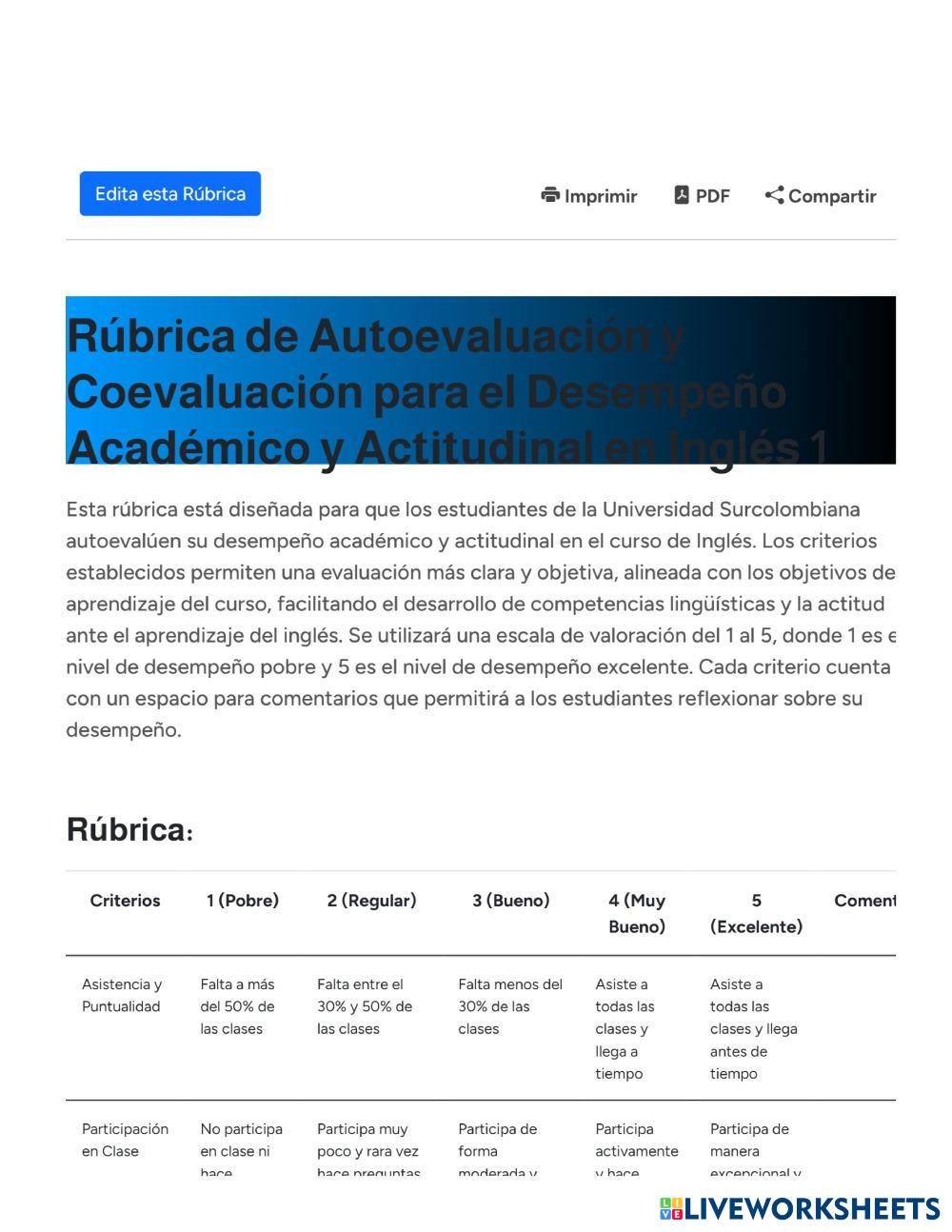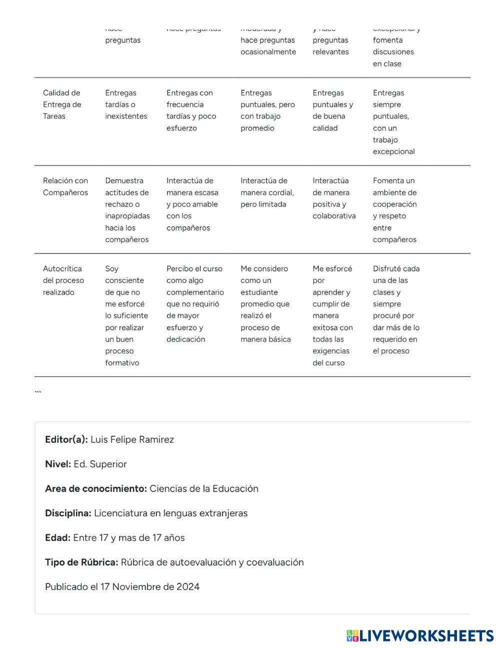 Created byLuis Felipe Ramírez Pérez English as a Second Language (ESL) Self assessment Age 17+ level: 1 English Author's Instructions Self Assessment for English Students at the Surcolombiana University, Neiva - Huila - Colombia My Google Classroom Courses × 0 classes selected (0 students total) Quick Access Select all classes (0 classes) All Classes Loading courses... Cancel Share Share to selected Course __COURSE_NAME__ __STUDENT_NAME__ (__STUDENT_EMAIL__) SELF ASSESSMENT Download Worksheet Validation Check my answers Emails my answers to my teacher Full name Group/level School subject Teacher's email or key code Close Submit Validating worksheet... (12) Your answers have been sent to your teacher. Good luck! OK We encountered an error submitting your answers. Please try again. OK Advertisement | Go Ad Free Created byLuis Felipe Ramírez Pérez English as a Second Language (ESL) Self assessment Age 17+ level: 1 English Author's Instructions Self Assessment for English Students at the Surcolombiana University, Neiva - Huila - Colombia