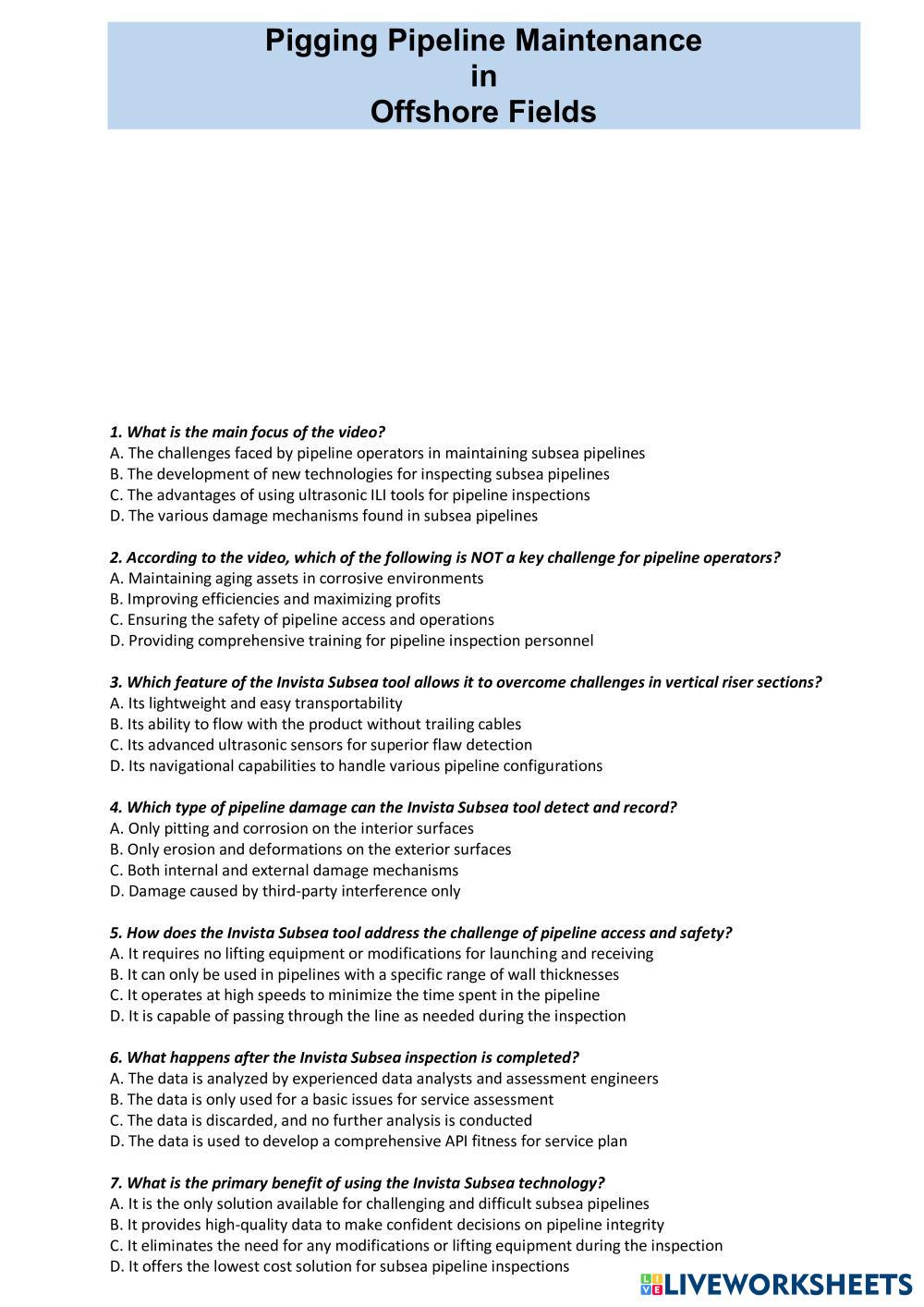 Created byTania English as a Second Language (ESL) Pigging Pipeline Maintenance in Offshore Fields Age 17+ level: b1 English Author's Instructions My Google Classroom Courses × 0 classes selected (0 students total) Quick Access Select all classes (0 classes) All Classes Loading courses... Cancel Share Share to selected Course __COURSE_NAME__ __STUDENT_NAME__ (__STUDENT_EMAIL__) Pigging Pipeline Maintenance in Offshore Fields Download Worksheet Validation Check my answers Emails my answers to my teacher Full name Group/level School subject Teacher's email or key code Close Submit Validating worksheet... (12) Your answers have been sent to your teacher. Good luck! OK We encountered an error submitting your answers. Please try again. OK Advertisement | Go Ad Free Created byTania English as a Second Language (ESL) Pigging Pipeline Maintenance in Offshore Fields Age 17+ level: b1 English Author's Instructions