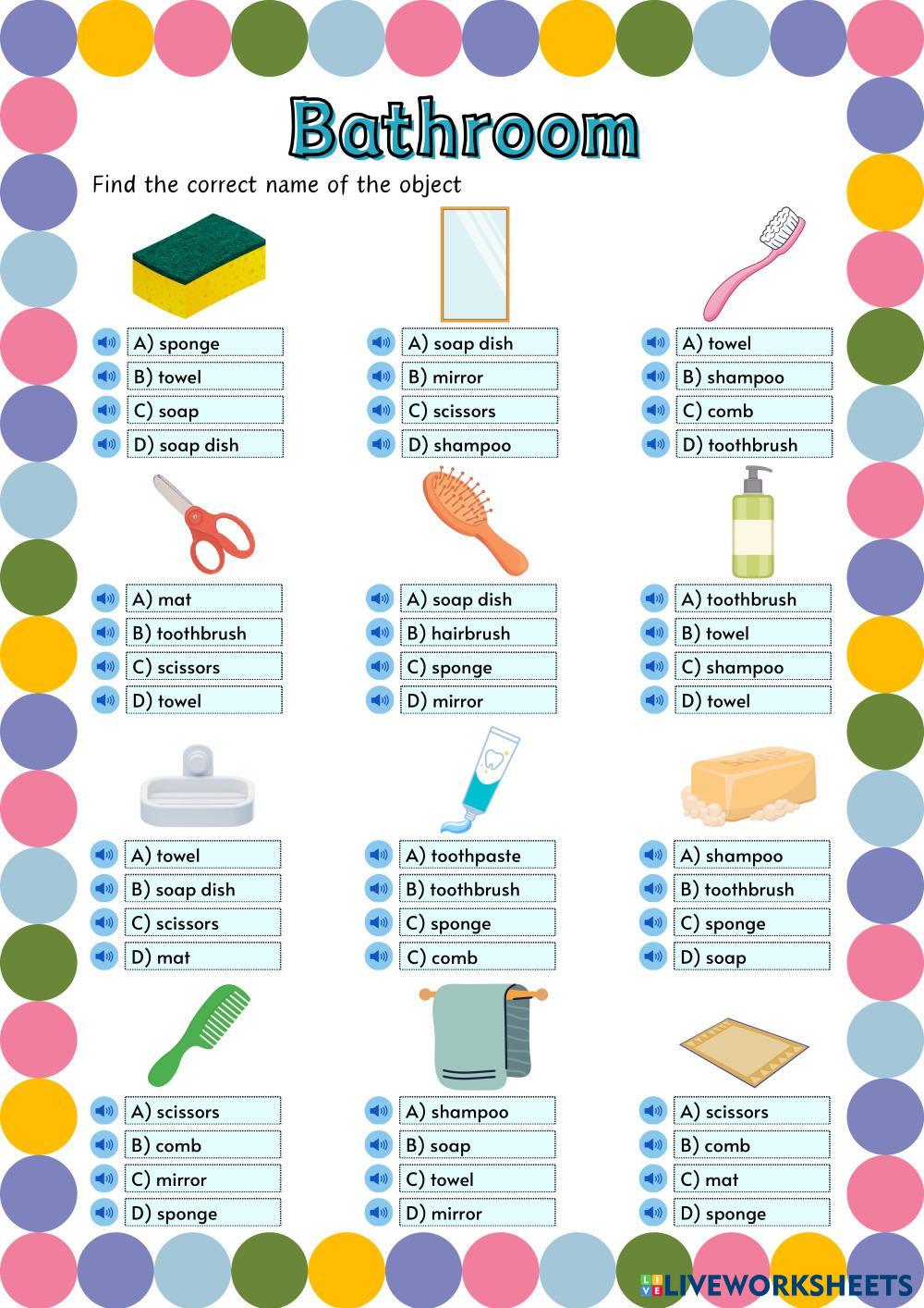 Created byAnni English as a Second Language (ESL) Bathroom vocabulary Age 5-13 level: A1 English Author's Instructions My Google Classroom Courses × 0 classes selected (0 students total) Quick Access Select all classes (0 classes) All Classes Loading courses... Cancel Share Share to selected Course __COURSE_NAME__ __STUDENT_NAME__ (__STUDENT_EMAIL__) A1:Bathroom Download Worksheet Validation Check my answers Emails my answers to my teacher Full name Group/level School subject Teacher's email or key code Close Submit Validating worksheet... (12) Your answers have been sent to your teacher. Good luck! OK We encountered an error submitting your answers. Please try again. OK Advertisement | Go Ad Free Created byAnni English as a Second Language (ESL) Bathroom vocabulary Age 5-13 level: A1 English Author's Instructions