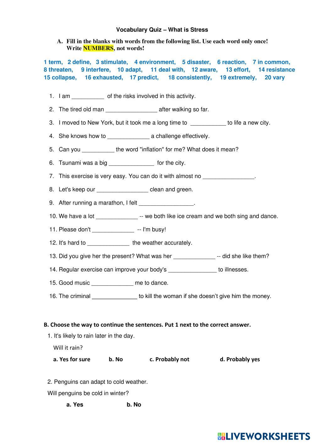 Created by Zhannaburstein English as a Second Language (ESL) Vocabulary Age 18+ level: M English Author's Instructions My Google Classroom Courses × 0 classes selected (0 students total) Quick Access Select all classes (0 classes) All Classes Loading courses... Cancel Share Share to selected Course __COURSE_NAME__ __STUDENT_NAME__ (__STUDENT_EMAIL__) What is Stress Download Worksheet Validation Check my answers Emails my answers to my teacher Full name Group/level School subject Teacher's email or key code Close Submit Validating worksheet... (12) Your answers have been sent to your teacher. Good luck! OK We encountered an error submitting your answers. Please try again. OK Advertisement | Go Ad Free Created by Zhannaburstein English as a Second Language (ESL) Vocabulary Age 18+ level: M English Author's Instructions