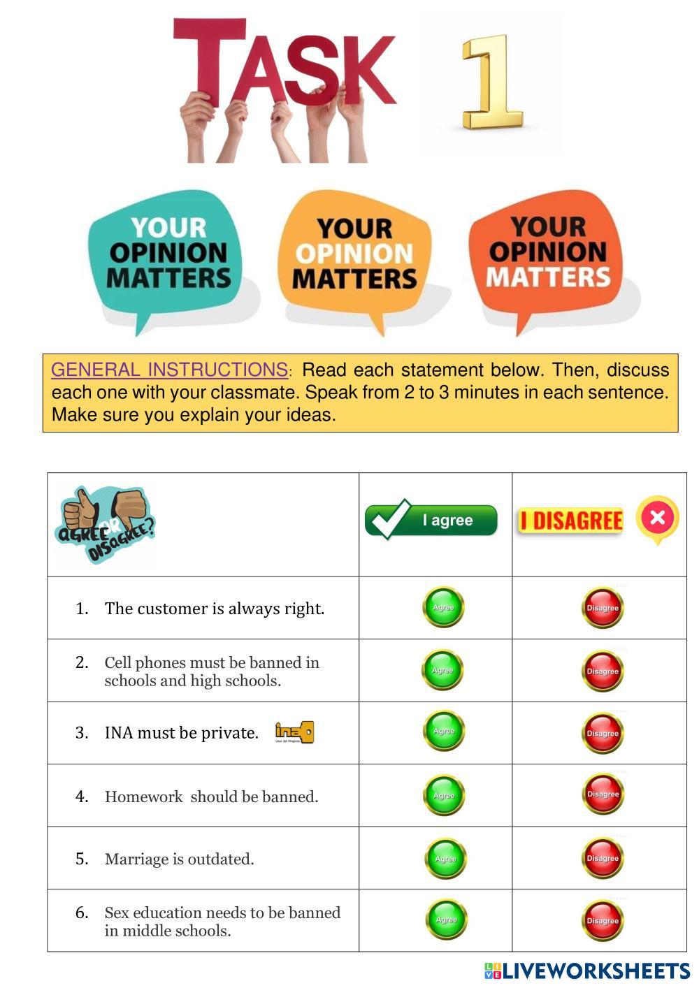 Created byTeacher Marlon English as a Second Language (ESL) Expressing opinions Age 6+ level: Intermediate English Author's Instructions opinions My Google Classroom Courses × 0 classes selected (0 students total) Quick Access Select all classes (0 classes) All Classes Loading courses... Cancel Share Share to selected Course __COURSE_NAME__ __STUDENT_NAME__ (__STUDENT_EMAIL__) OPINIONS Download Worksheet Validation Check my answers Emails my answers to my teacher Full name Group/level School subject Teacher's email or key code Close Submit Validating worksheet... (12) Your answers have been sent to your teacher. Good luck! OK We encountered an error submitting your answers. Please try again. OK Advertisement | Go Ad Free Created byTeacher Marlon English as a Second Language (ESL) Expressing opinions Age 6+ level: Intermediate English Author's Instructions opinions