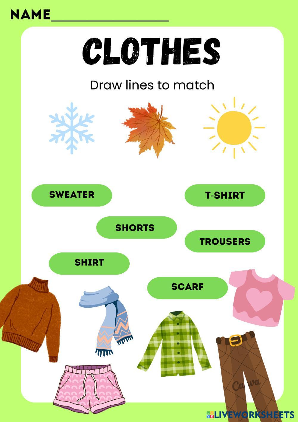 Created by Liya2021 English as a Second Language (ESL) Vocabulary Age 3-8 level: low English Author's Instructions My Google Classroom Courses × 0 classes selected (0 students total) Quick Access Select all classes (0 classes) All Classes Loading courses... Cancel Share Share to selected Course __COURSE_NAME__ __STUDENT_NAME__ (__STUDENT_EMAIL__) Clothes Download Worksheet Validation Check my answers Emails my answers to my teacher Full name Group/level School subject Teacher's email or key code Close Submit Validating worksheet... (12) Your answers have been sent to your teacher. Good luck! OK We encountered an error submitting your answers. Please try again. OK Advertisement | Go Ad Free Created by Liya2021 English as a Second Language (ESL) Vocabulary Age 3-8 level: low English Author's Instructions