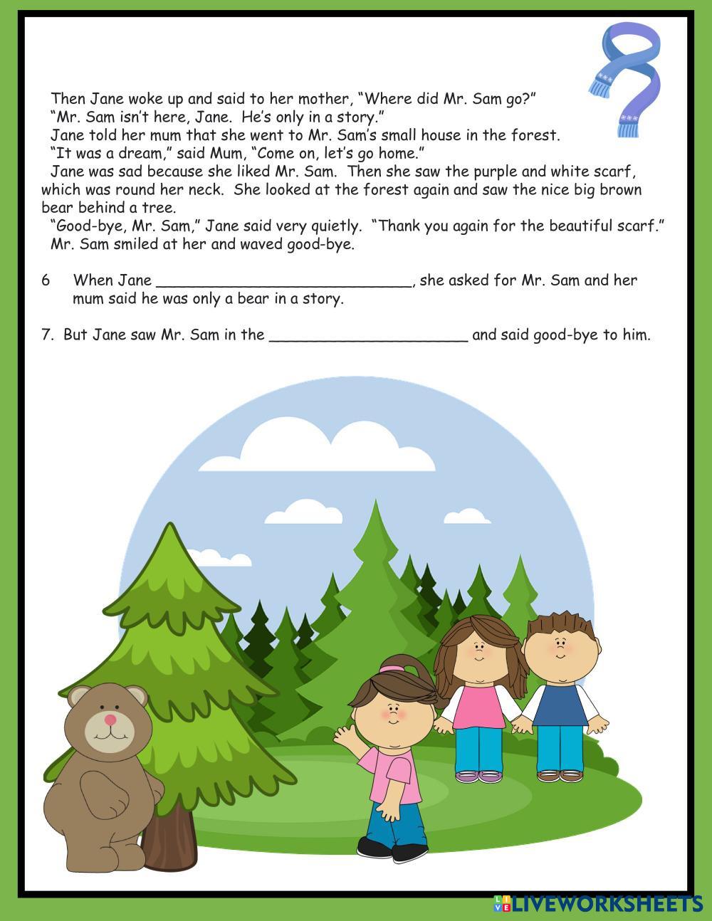 Created by estherlee76 English as a Second Language (ESL) Reading comprehension Age 6+ level: A1 English Author's Instructions Read and answer the questions My Google Classroom Courses × 0 classes selected (0 students total) Quick Access Select all classes (0 classes) All Classes Loading courses... Cancel Share Share to selected Course __COURSE_NAME__ __STUDENT_NAME__ (__STUDENT_EMAIL__) Mr Sam the Bear A1 Reader Fairy Tales Fantasy Download Worksheet Validation Check my answers Emails my answers to my teacher Full name Group/level School subject Teacher's email or key code Close Submit Validating worksheet... (12) Your answers have been sent to your teacher. Good luck! OK We encountered an error submitting your answers. Please try again. OK Advertisement | Go Ad Free Created by estherlee76 English as a Second Language (ESL) Reading comprehension Age 6+ level: A1 English Author's Instructions Read and answer the questions