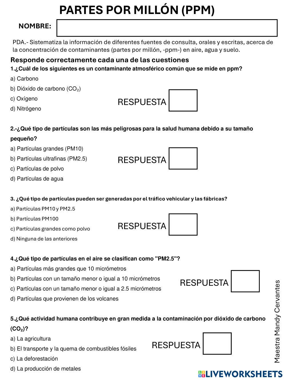 Created byAmanda Cervantes QUÍMICA SCIENCE Age 13+ level: SECUNDARIA Spanish Author's Instructions My Google Classroom Courses × 0 classes selected (0 students total) Quick Access Select all classes (0 classes) All Classes Loading courses... Cancel Share Share to selected Course __COURSE_NAME__ __STUDENT_NAME__ (__STUDENT_EMAIL__) PARTES POR MILLÓN Download Worksheet Validation Check my answers Emails my answers to my teacher Full name Group/level School subject Teacher's email or key code Close Submit Validating worksheet... (12) Your answers have been sent to your teacher. Good luck! OK We encountered an error submitting your answers. Please try again. OK Advertisement | Go Ad Free Created byAmanda Cervantes QUÍMICA SCIENCE Age 13+ level: SECUNDARIA Spanish Author's Instructions
