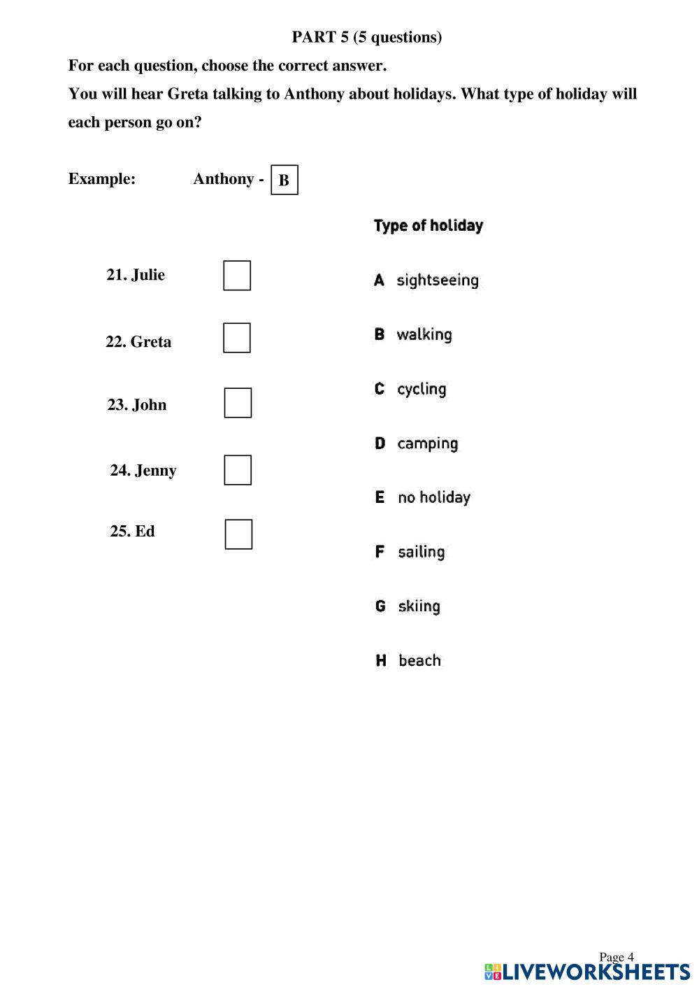 Created byEnglish English as a Second Language (ESL) Ket listening test Age 6-15 level: Pre-A1 English Author's Instructions My Google Classroom Courses × 0 classes selected (0 students total) Quick Access Select all classes (0 classes) All Classes Loading courses... Cancel Share Share to selected Course __COURSE_NAME__ __STUDENT_NAME__ (__STUDENT_EMAIL__) KET LISTENING TEST 13 Download Worksheet Validation Check my answers Emails my answers to my teacher Full name Group/level School subject Teacher's email or key code Close Submit Validating worksheet... (12) Your answers have been sent to your teacher. Good luck! OK We encountered an error submitting your answers. Please try again. OK Advertisement | Go Ad Free Created byEnglish English as a Second Language (ESL) Ket listening test Age 6-15 level: Pre-A1 English Author's Instructions