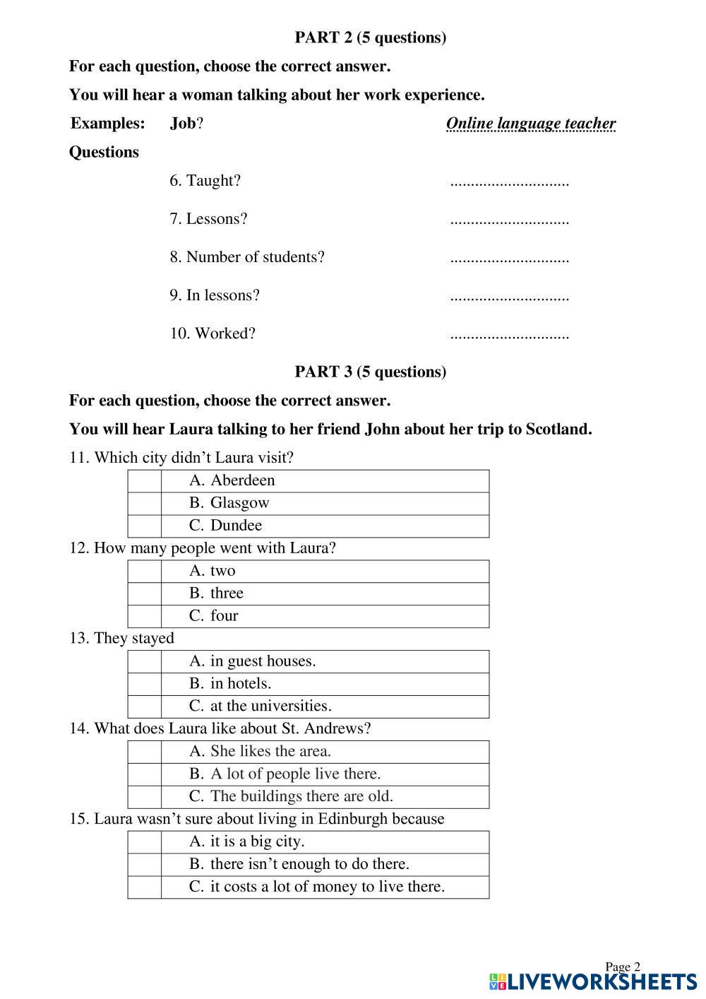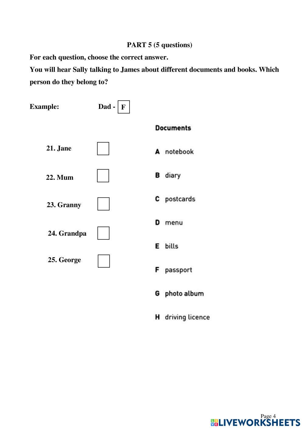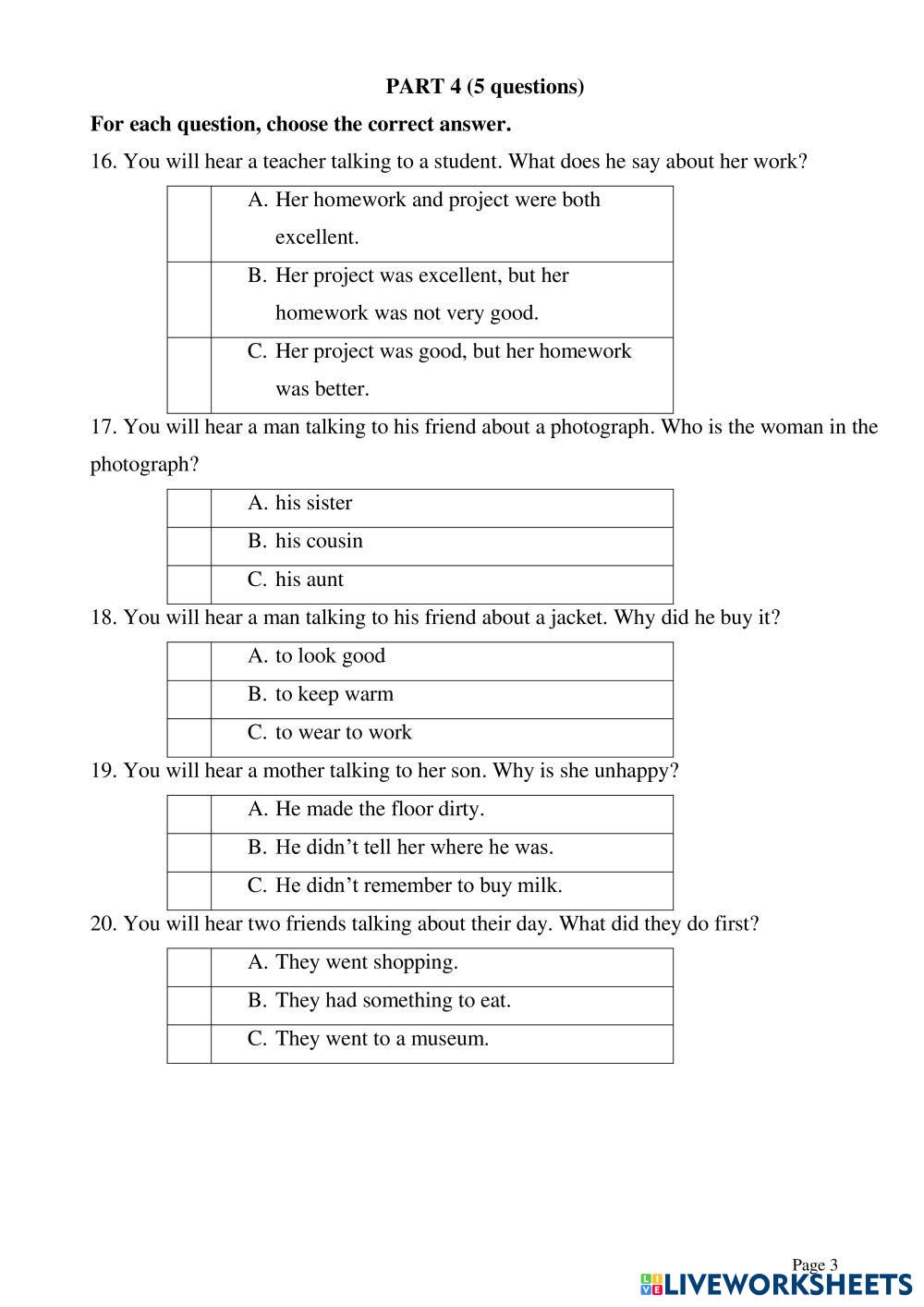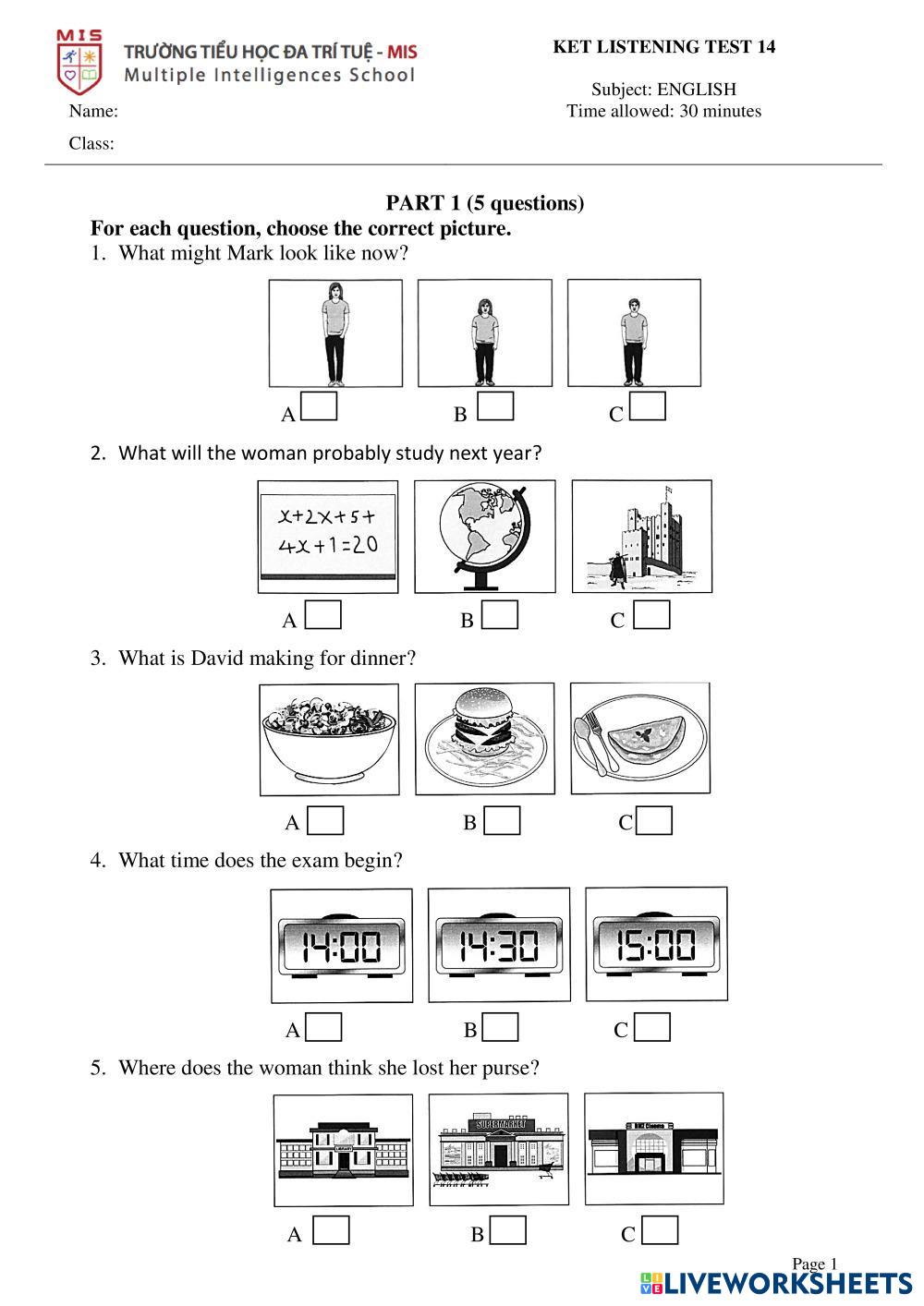 Created byEnglish English as a Second Language (ESL) Ket listening test Age 6-15 level: Pre-A1 English Author's Instructions My Google Classroom Courses × 0 classes selected (0 students total) Quick Access Select all classes (0 classes) All Classes Loading courses... Cancel Share Share to selected Course __COURSE_NAME__ __STUDENT_NAME__ (__STUDENT_EMAIL__) KET LISTENING TEST 14 Download Worksheet Validation Check my answers Emails my answers to my teacher Full name Group/level School subject Teacher's email or key code Close Submit Validating worksheet... (12) Your answers have been sent to your teacher. Good luck! OK We encountered an error submitting your answers. Please try again. OK Advertisement | Go Ad Free Created byEnglish English as a Second Language (ESL) Ket listening test Age 6-15 level: Pre-A1 English Author's Instructions