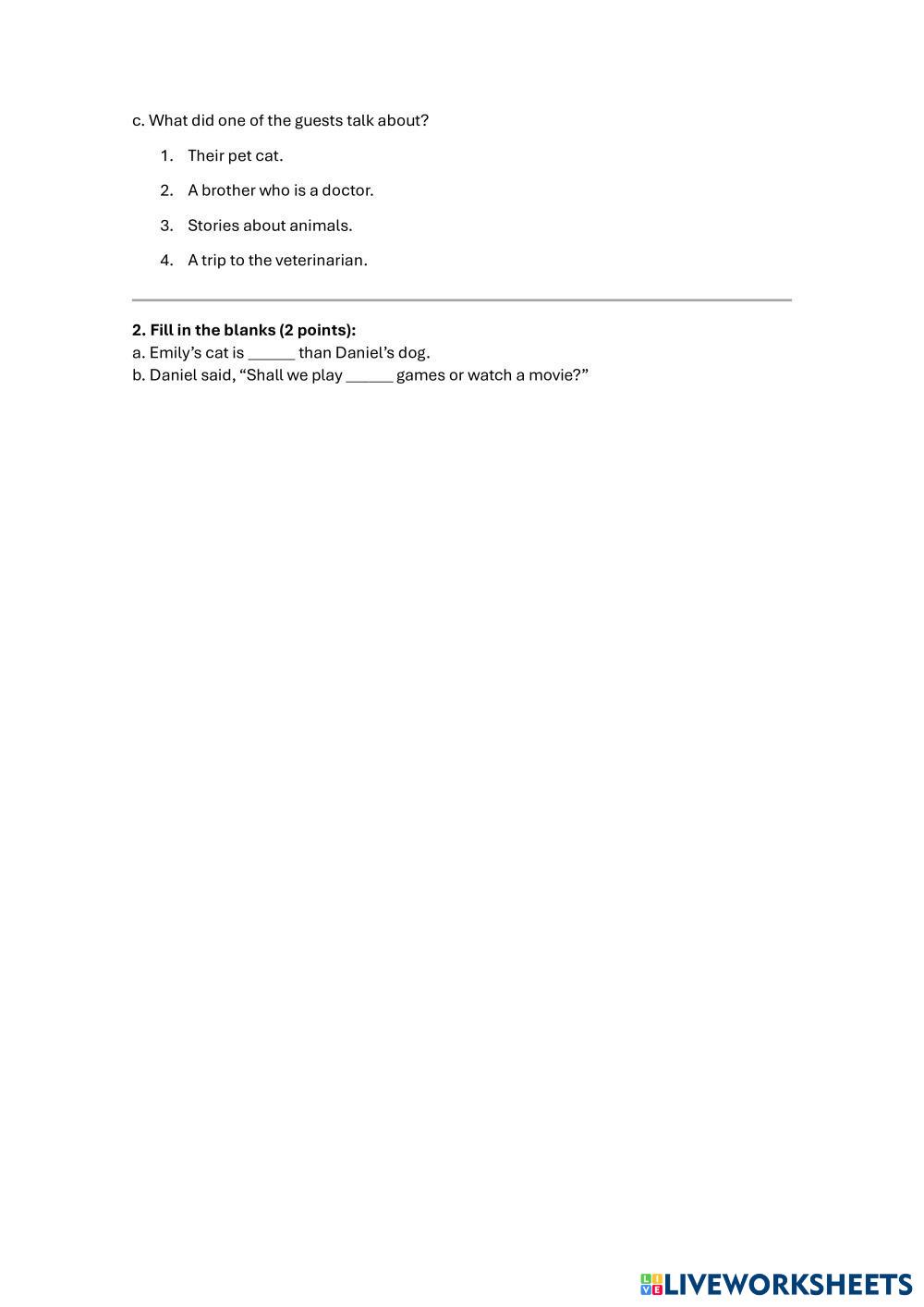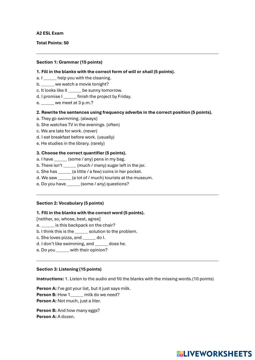 Created byLaura Enciso English as a Second Language (ESL) Quiz Age 18+ level: A2 English Author's Instructions My Google Classroom Courses × 0 classes selected (0 students total) Quick Access Select all classes (0 classes) All Classes Loading courses... Cancel Share Share to selected Course __COURSE_NAME__ __STUDENT_NAME__ (__STUDENT_EMAIL__) Quiz A2 ( stage 2) Download Worksheet Validation Check my answers Emails my answers to my teacher Full name Group/level School subject Teacher's email or key code Close Submit Validating worksheet... (12) Your answers have been sent to your teacher. Good luck! OK We encountered an error submitting your answers. Please try again. OK Advertisement | Go Ad Free Created byLaura Enciso English as a Second Language (ESL) Quiz Age 18+ level: A2 English Author's Instructions
