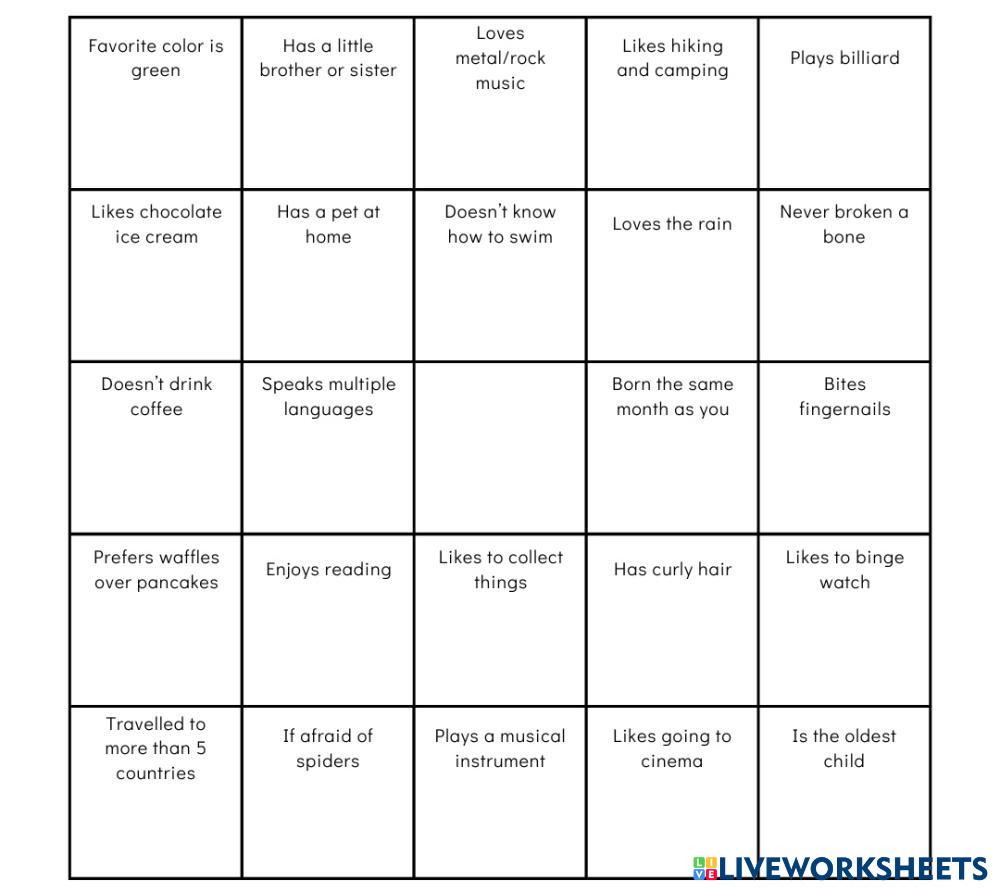 Created byAnna English as a Second Language (ESL) Describing people Age 17+ level: Elementary English Author's Instructions My Google Classroom Courses × 0 classes selected (0 students total) Quick Access Select all classes (0 classes) All Classes Loading courses... Cancel Share Share to selected Course __COURSE_NAME__ __STUDENT_NAME__ (__STUDENT_EMAIL__) Bingo A10 Download Worksheet Validation Check my answers Emails my answers to my teacher Full name Group/level School subject Teacher's email or key code Close Submit Validating worksheet... (12) Your answers have been sent to your teacher. Good luck! OK We encountered an error submitting your answers. Please try again. OK Advertisement | Go Ad Free Created byAnna English as a Second Language (ESL) Describing people Age 17+ level: Elementary English Author's Instructions