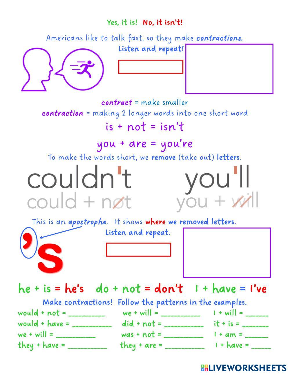 Students review names of body parts by answering yes/no questions about them. To answer the questions, they first learn how to form contractions.