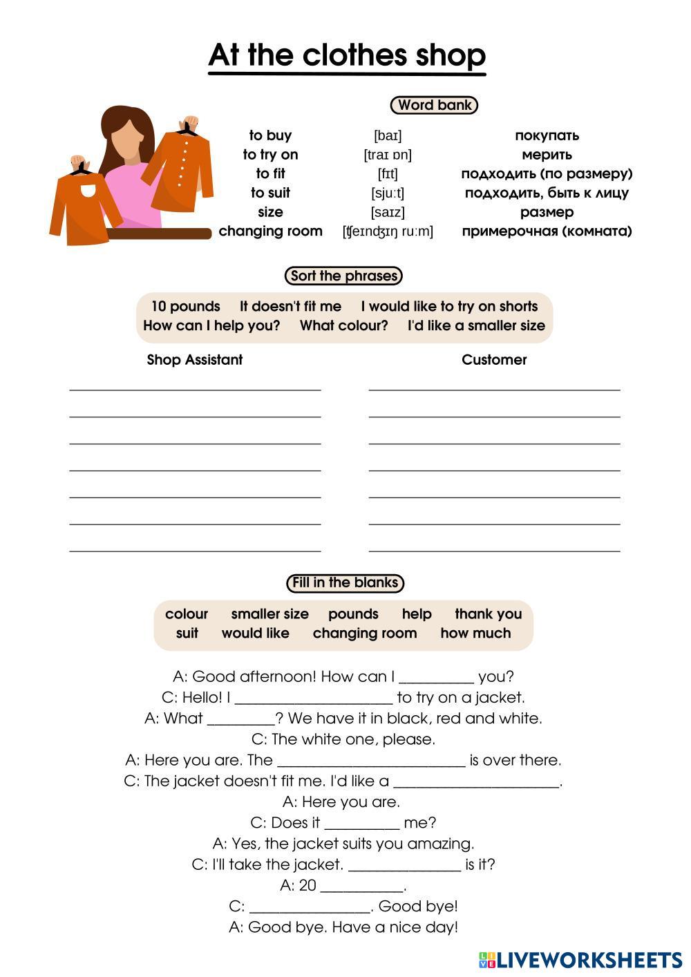 Created by elizamaleiko English as a Second Language (ESL) Clthes Age 12-16 level: Elementary English Author's Instructions My Google Classroom Courses × 0 classes selected (0 students total) Quick Access Select all classes (0 classes) All Classes Loading courses... Cancel Share Share to selected Course __COURSE_NAME__ __STUDENT_NAME__ (__STUDENT_EMAIL__) At the clothes shop Download Worksheet Validation Check my answers Emails my answers to my teacher Full name Group/level School subject Teacher's email or key code Close Submit Validating worksheet... (12) Your answers have been sent to your teacher. Good luck! OK We encountered an error submitting your answers. Please try again. OK Advertisement | Go Ad Free Created by elizamaleiko English as a Second Language (ESL) Clthes Age 12-16 level: Elementary English Author's Instructions