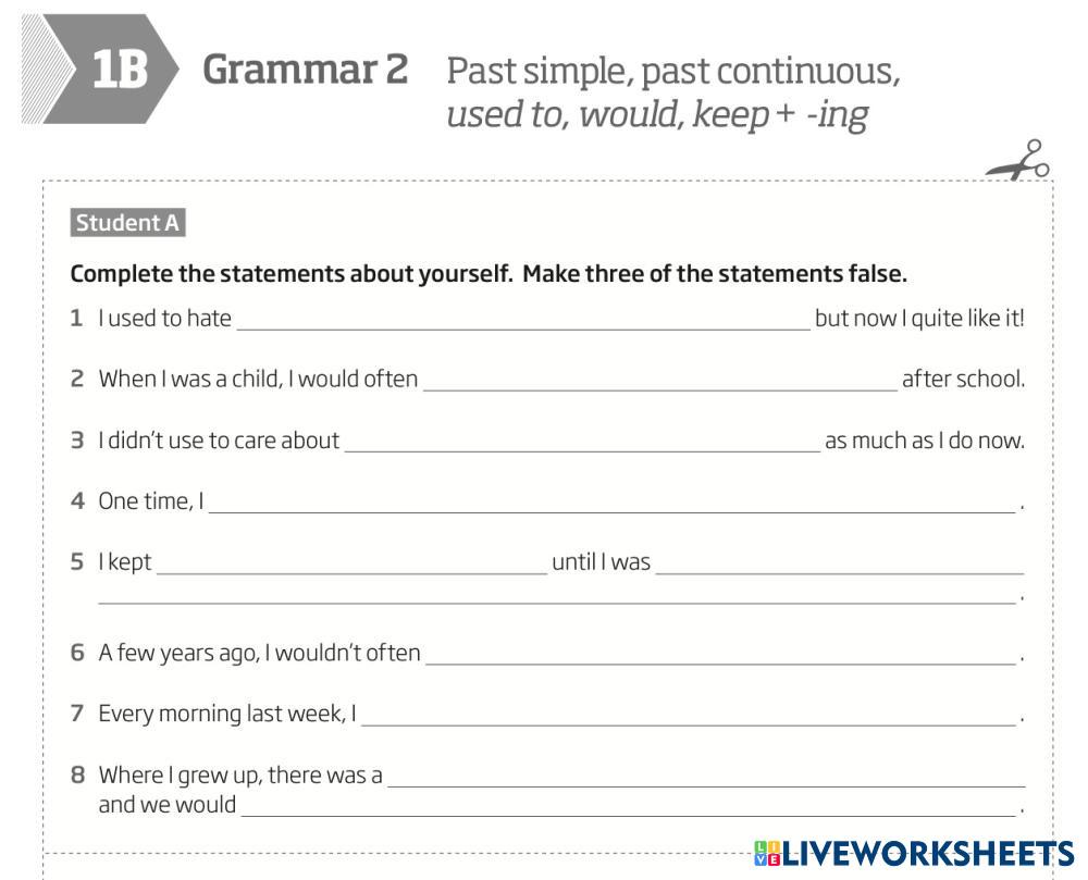 Created byThe Touchstone Academy English as a Second Language (ESL) Past tenses Age 16+ level: B2 English Author's Instructions My Google Classroom Courses × 0 classes selected (0 students total) Quick Access Select all classes (0 classes) All Classes Loading courses... Cancel Share Share to selected Course __COURSE_NAME__ __STUDENT_NAME__ (__STUDENT_EMAIL__) Roadmap B2 |1B| Past simple, past continuous, used to, would, keep + -ing. Student A Download Worksheet Validation Check my answers Emails my answers to my teacher Full name Group/level School subject Teacher's email or key code Close Submit Validating worksheet... (12) Your answers have been sent to your teacher. Good luck! OK We encountered an error submitting your answers. Please try again. OK Advertisement | Go Ad Free Created byThe Touchstone Academy English as a Second Language (ESL) Past tenses Age 16+ level: B2 English Author's Instructions