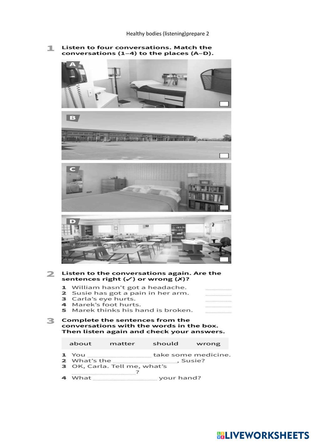 Created by komushan English as a Second Language (ESL) Listening Age 8-16 level: elementary English Author's Instructions My Google Classroom Courses × 0 classes selected (0 students total) Quick Access Select all classes (0 classes) All Classes Loading courses... Cancel Share Share to selected Course __COURSE_NAME__ __STUDENT_NAME__ (__STUDENT_EMAIL__) healthy bodies listening Download Worksheet Validation Check my answers Emails my answers to my teacher Full name Group/level School subject Teacher's email or key code Close Submit Validating worksheet... (12) Your answers have been sent to your teacher. Good luck! OK We encountered an error submitting your answers. Please try again. OK Advertisement | Go Ad Free Created by komushan English as a Second Language (ESL) Listening Age 8-16 level: elementary English Author's Instructions