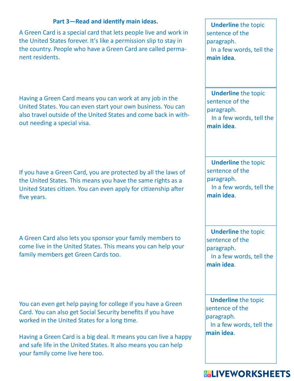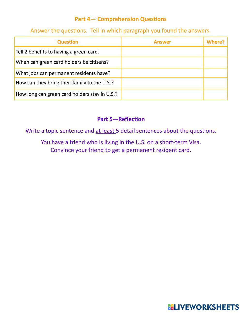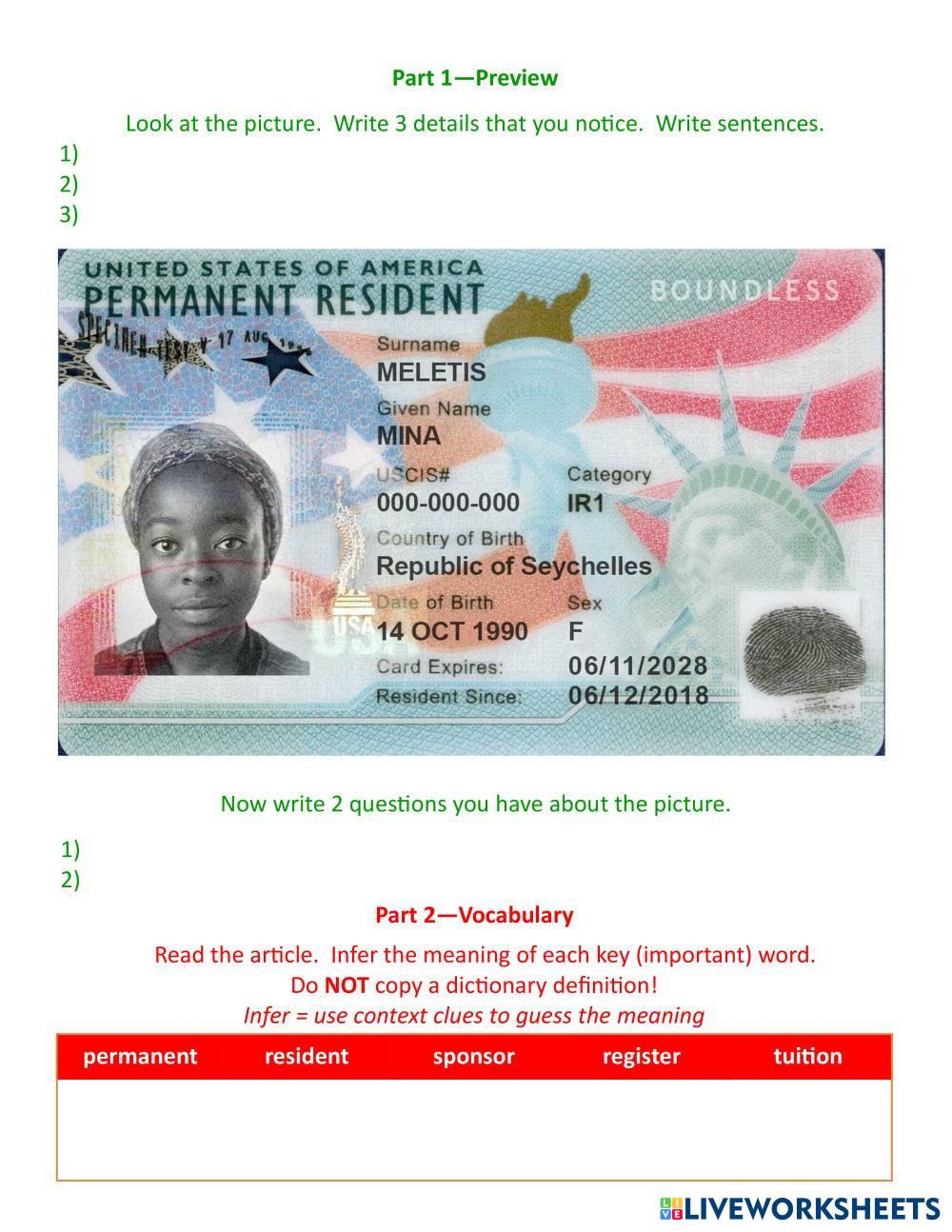 Students preview the article by examining a permanent resident card. Students read the article and write the main idea of each paragraph. Students infer target vocabulary from context clues in the article. Students answer reading comprehension questions about the article. Students write a short reflection about the article.