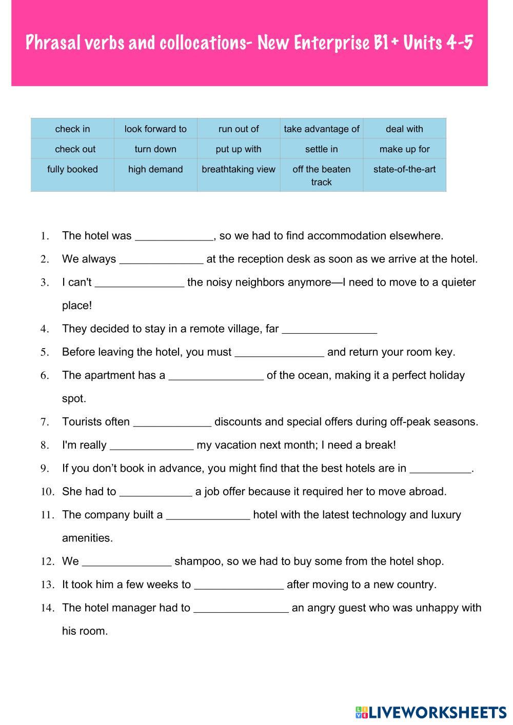 Phrasal verbs and collocations for unit 4 and 5 New Enterprise B1+